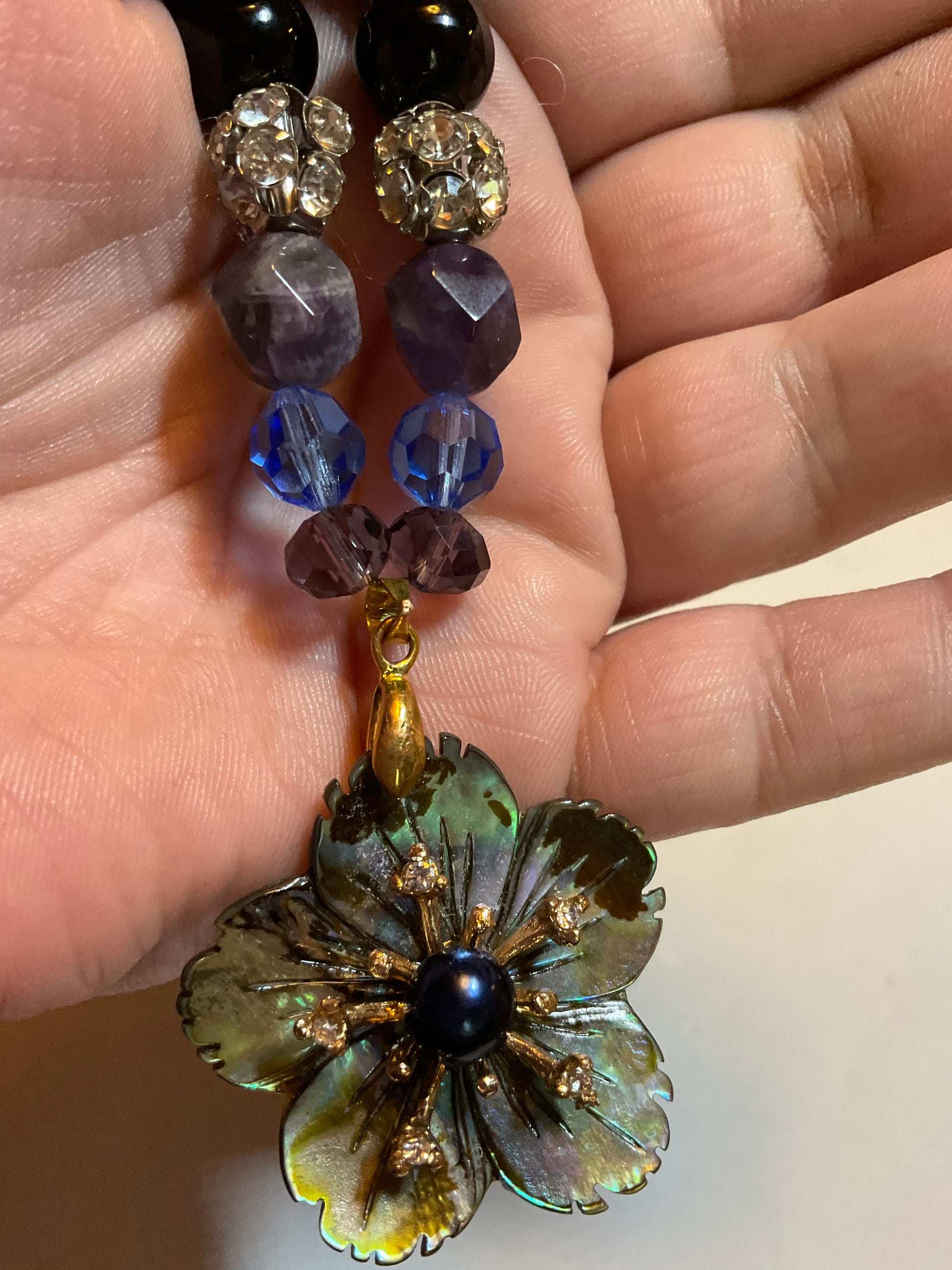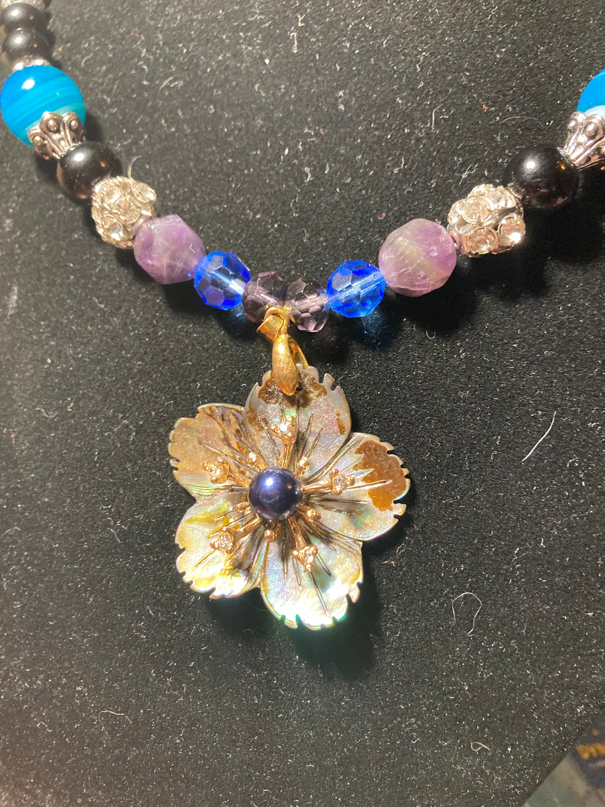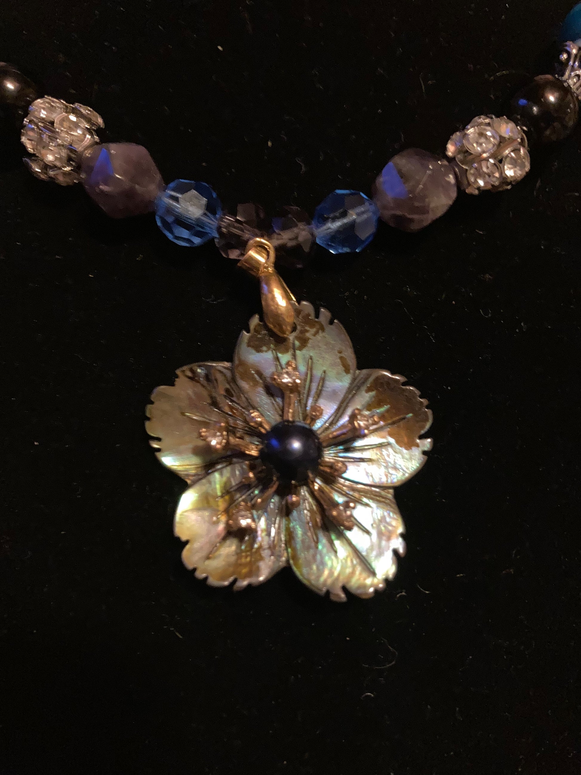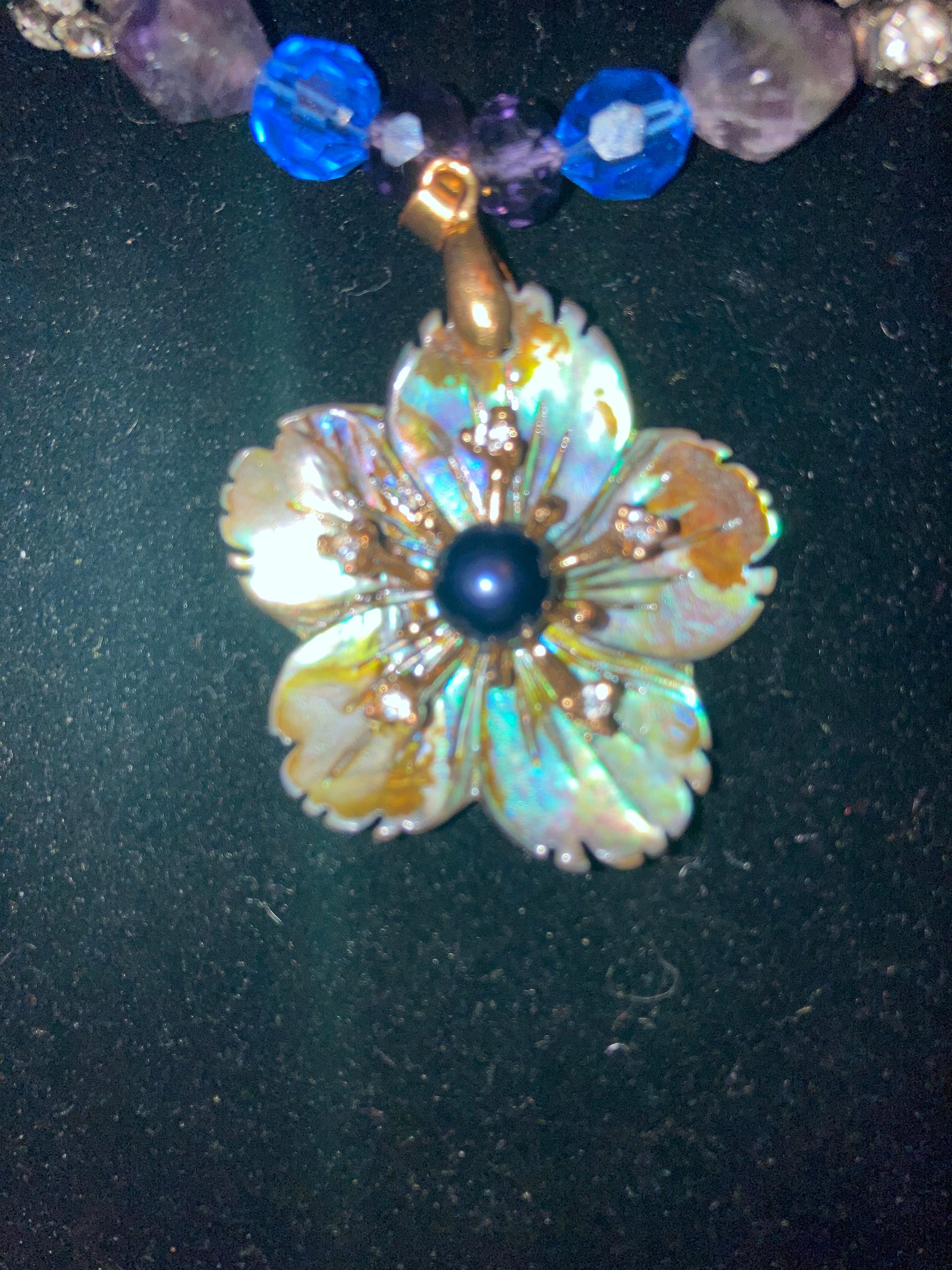 Handmade Abalone Flower blossom pendant on a beautifully beaded gemstone & Swarovski crystal necklace. Crystals mixed together with semiprecious gemstones including Sapphire, Amethyst, quartz, moonstones, the photos don’t do this beauty justice! The perfect gift as unique and beautiful as you or that special person in your life. Thank you for looking, & visiting my site! All orders come gift boxed and wrapped in ribbon.