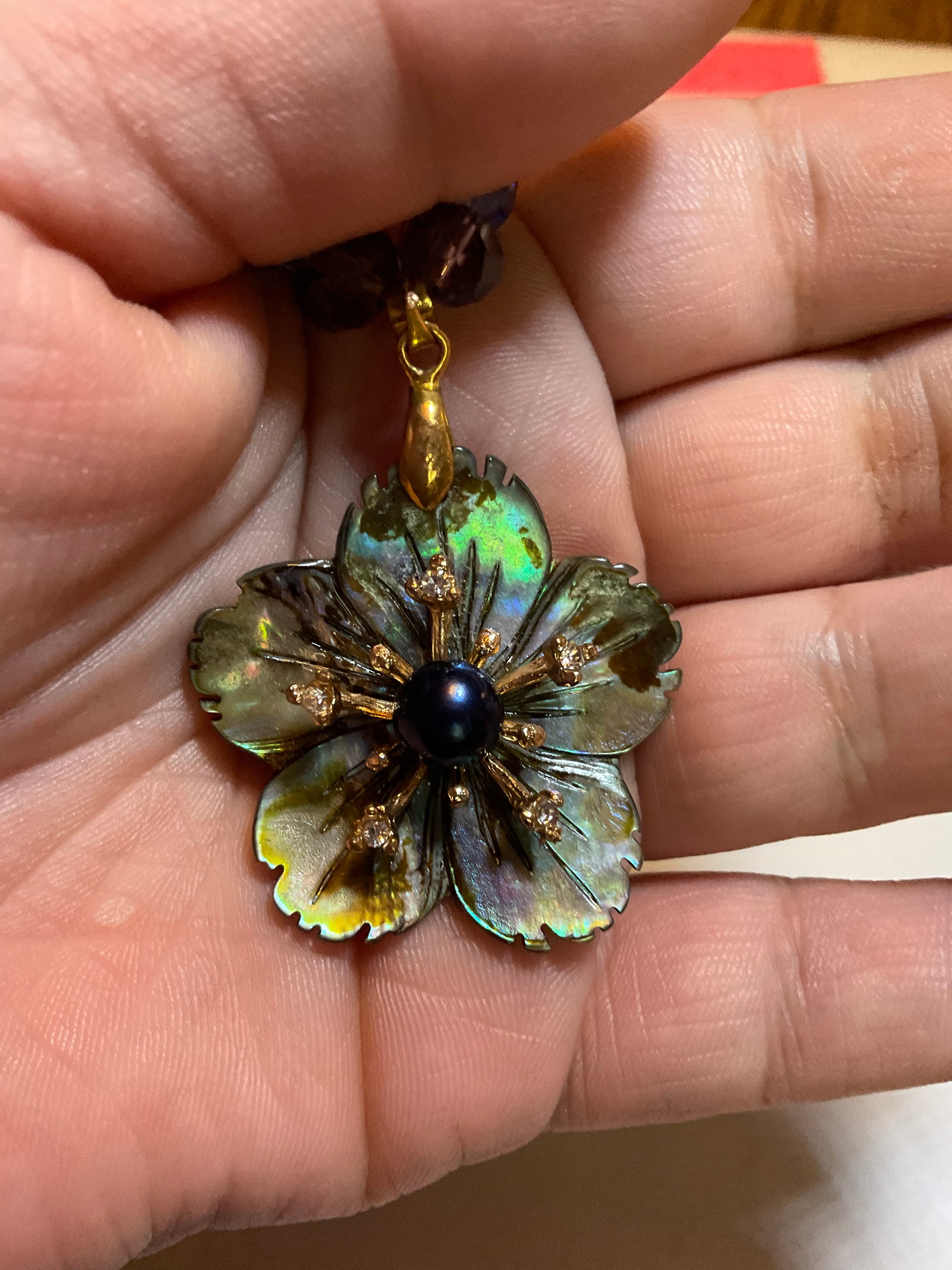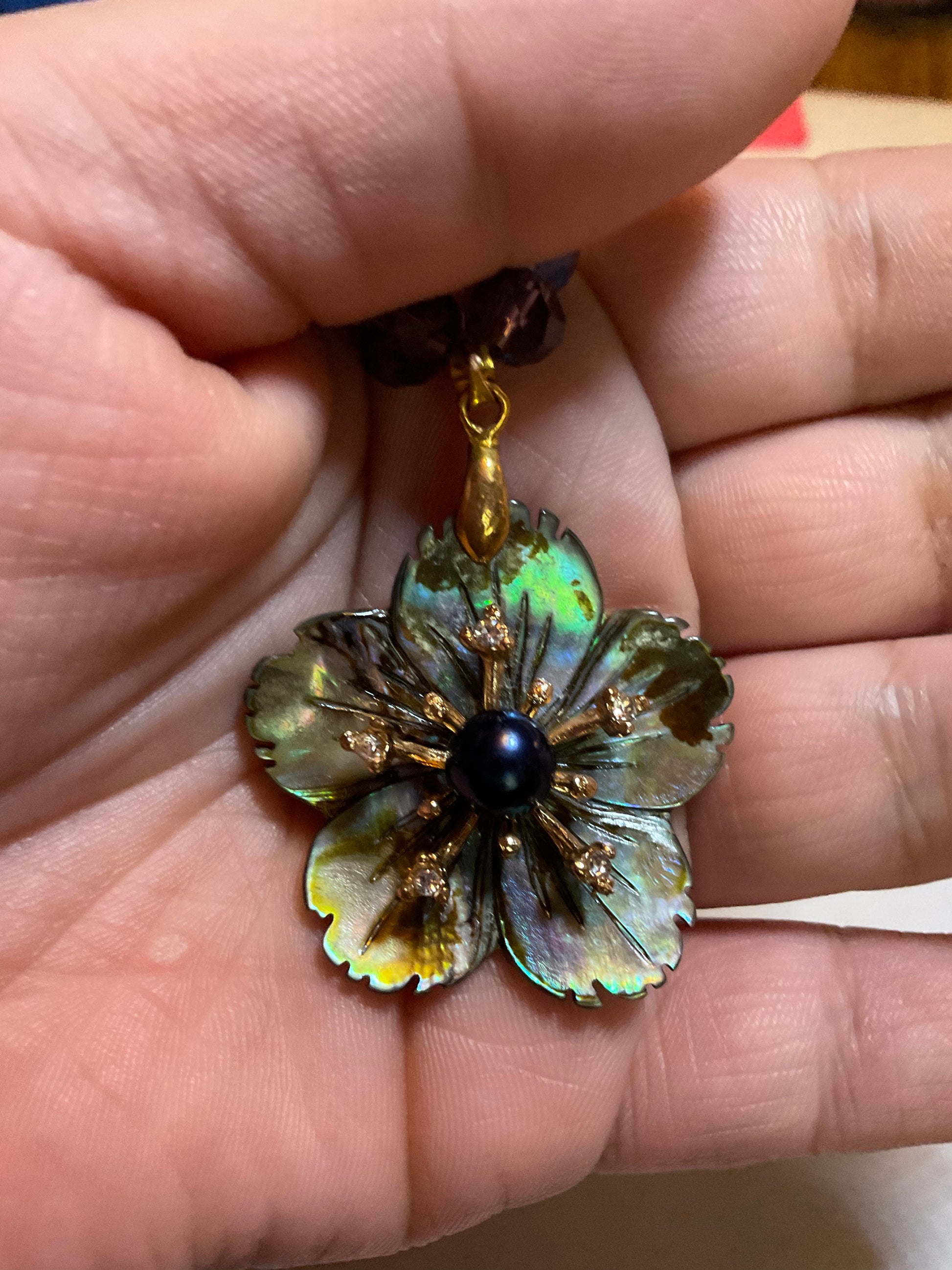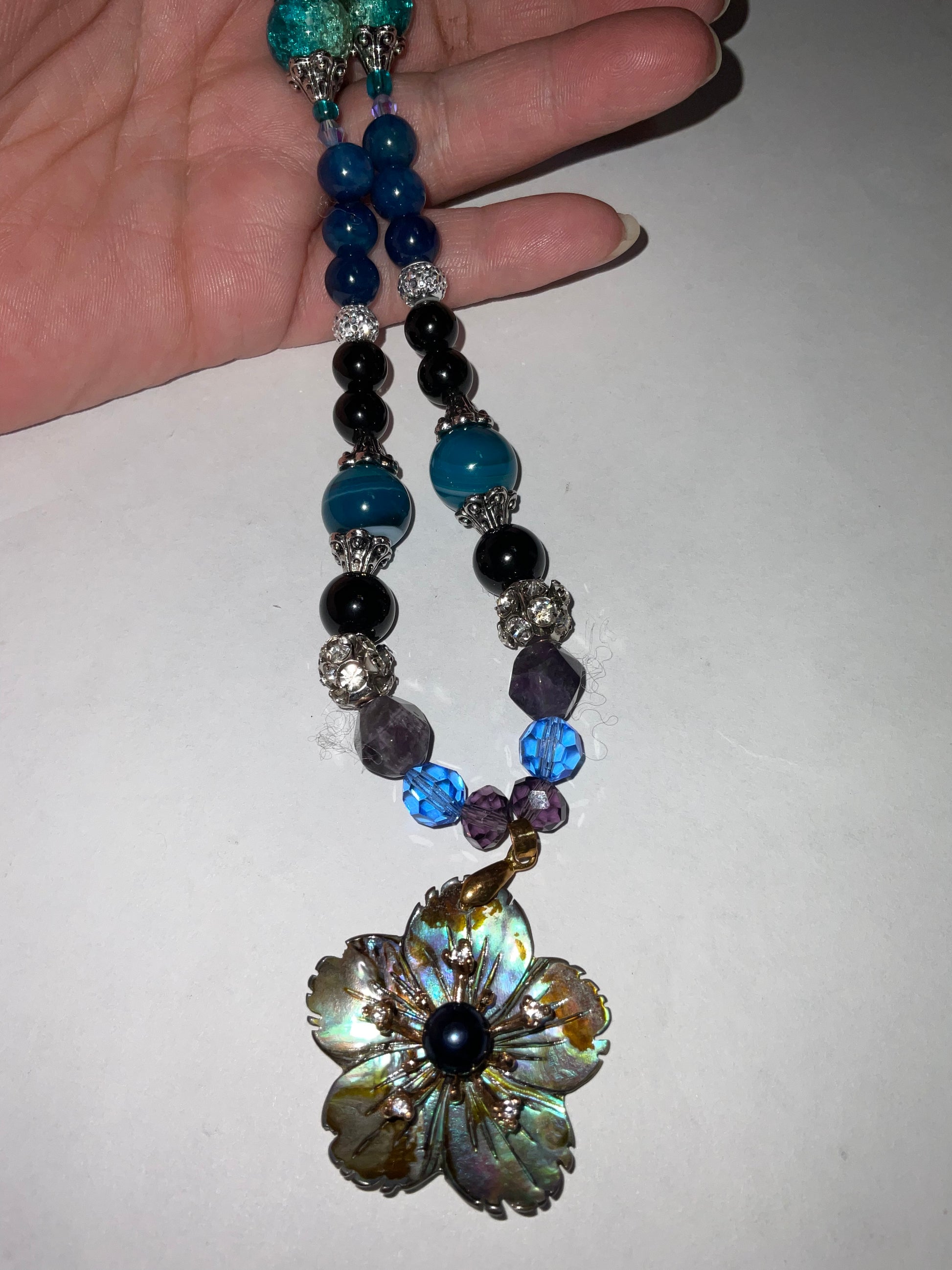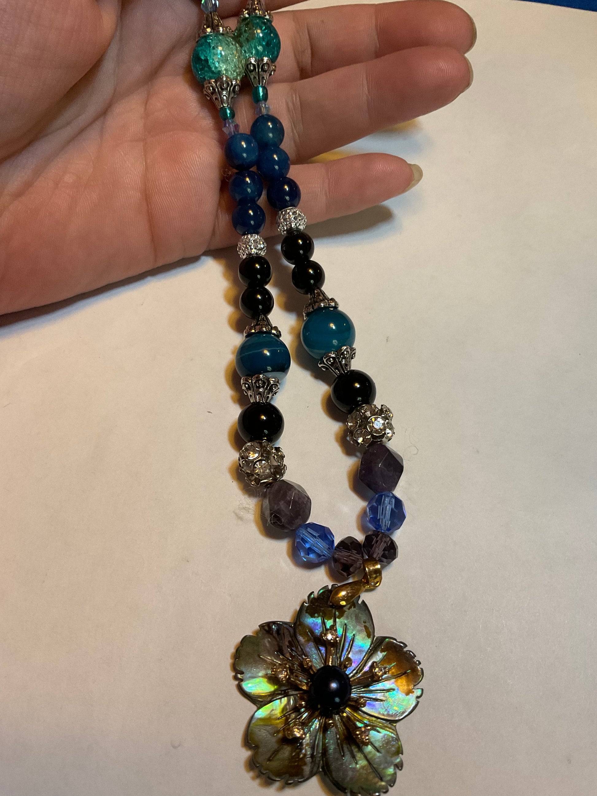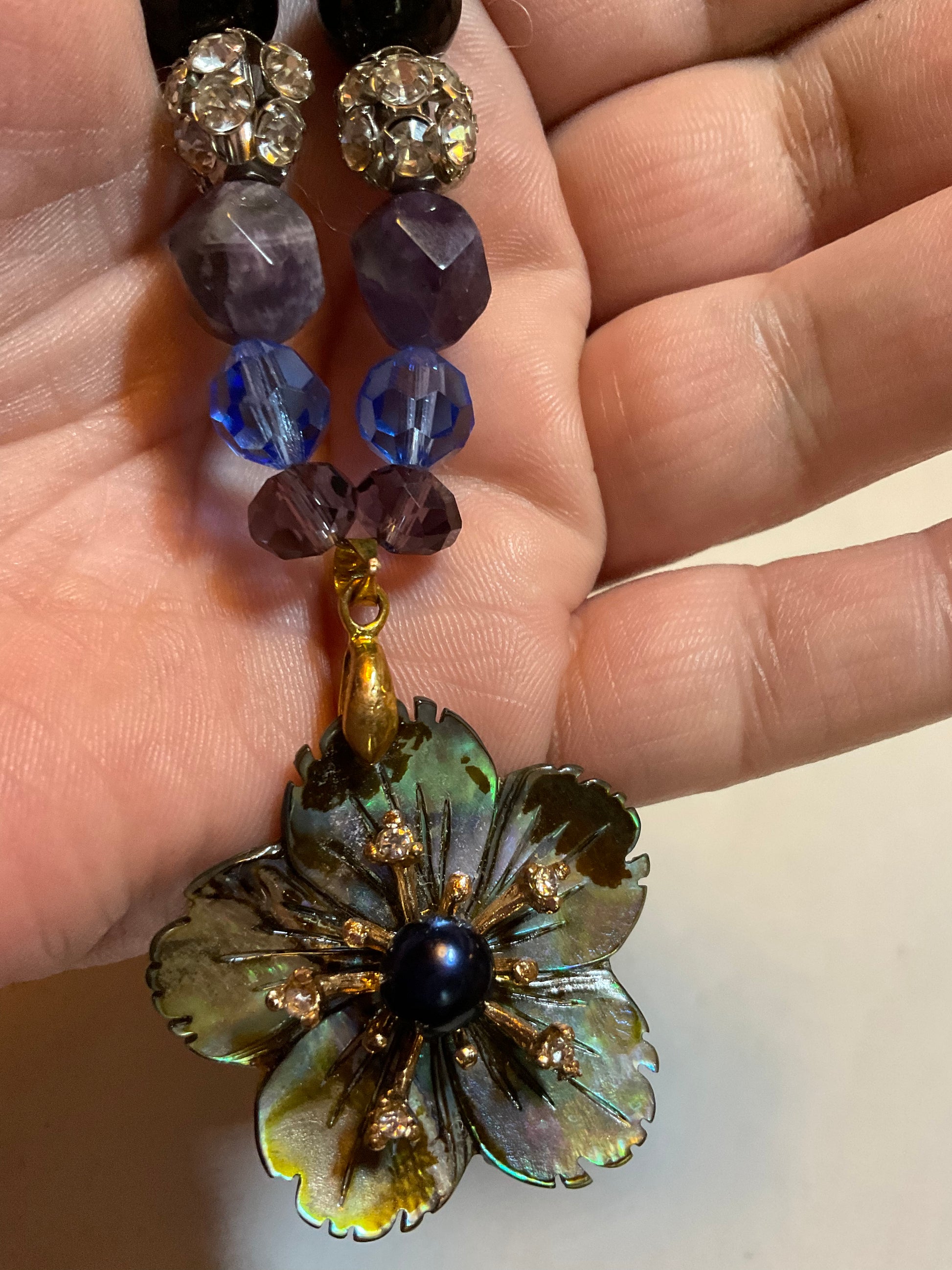 Handmade Abalone Flower blossom pendant on a beautifully beaded gemstone & Swarovski crystal necklace. Crystals mixed together with semiprecious gemstones including Sapphire, Amethyst, quartz, moonstones, the photos don’t do this beauty justice! The perfect gift as unique and beautiful as you or that special person in your life. Thank you for looking, & visiting my site! All orders come gift boxed and wrapped in ribbon.