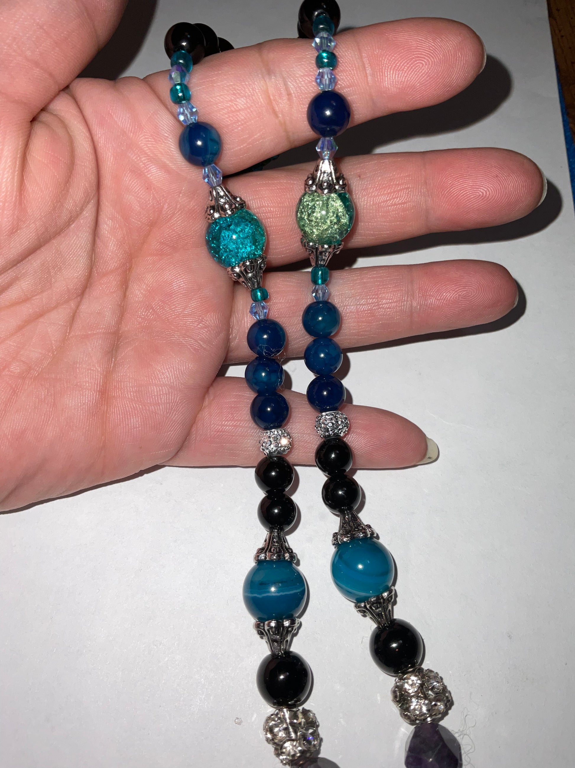 Abalone pendant, Sapphire Swarovski crystal, semiprecious gemstones Amethyst, Quartz, moonstone. Lobster claw clasp, monofilament string.