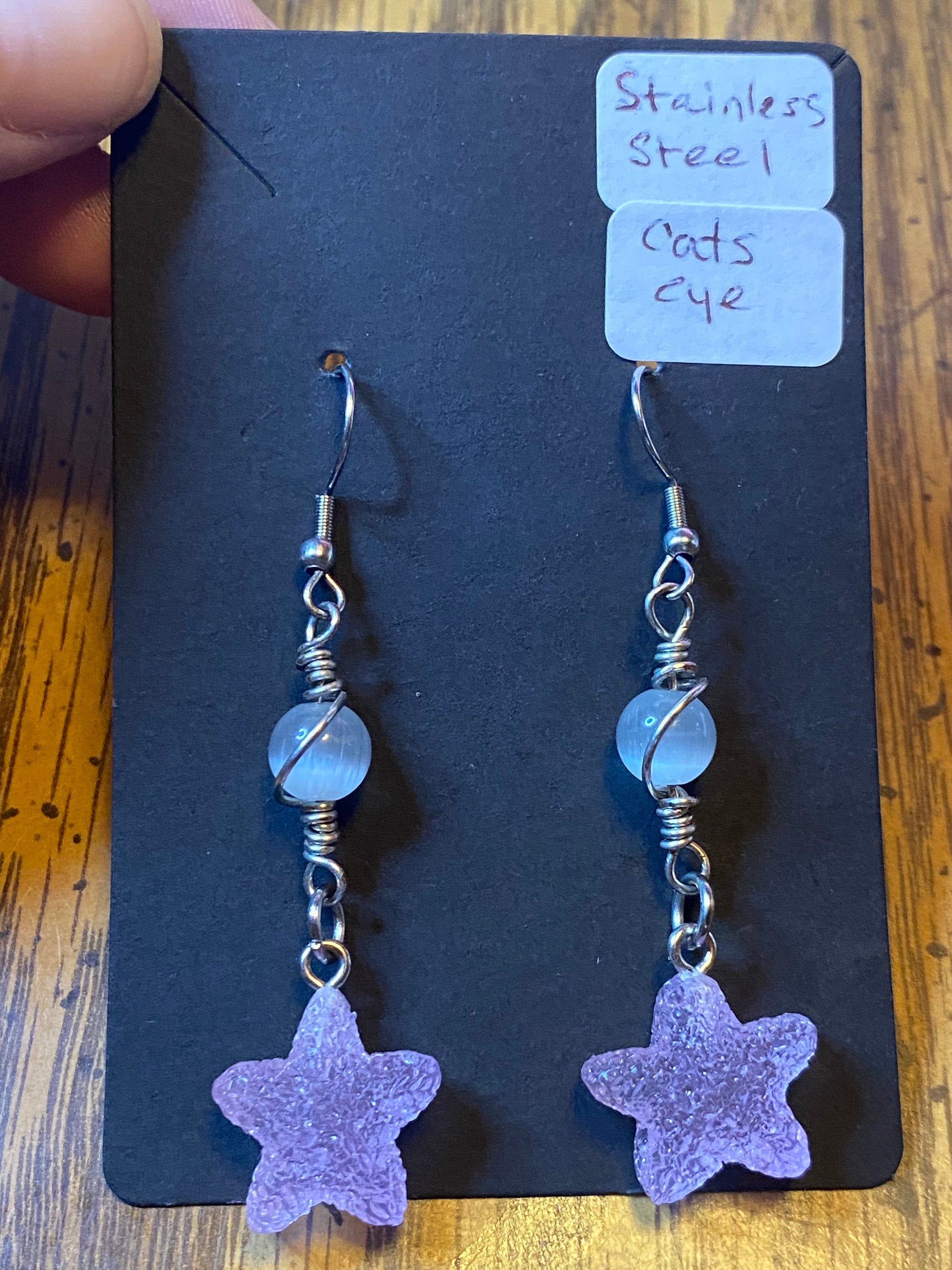 Add a touch of celestial charm and fun to your outfit with our Among the Stars Cats Eye Stainless Steel Earrings. These hypoallergenic earrings feature white cats eye beads representing the moon and planets, suspended above purple resin stars with a sugar-coated appearance. The stainless steel earring wires add durability and measure 2.5" long, with the stars measuring 3/4" by 5/8". Shine bright like a star with these unique and playful earrings.