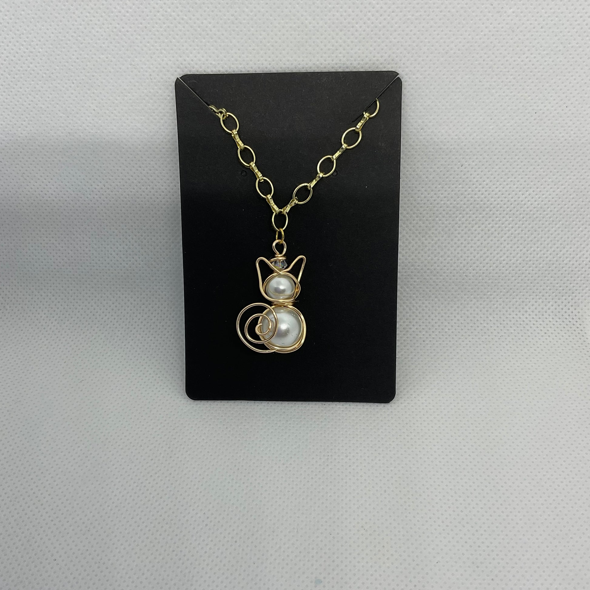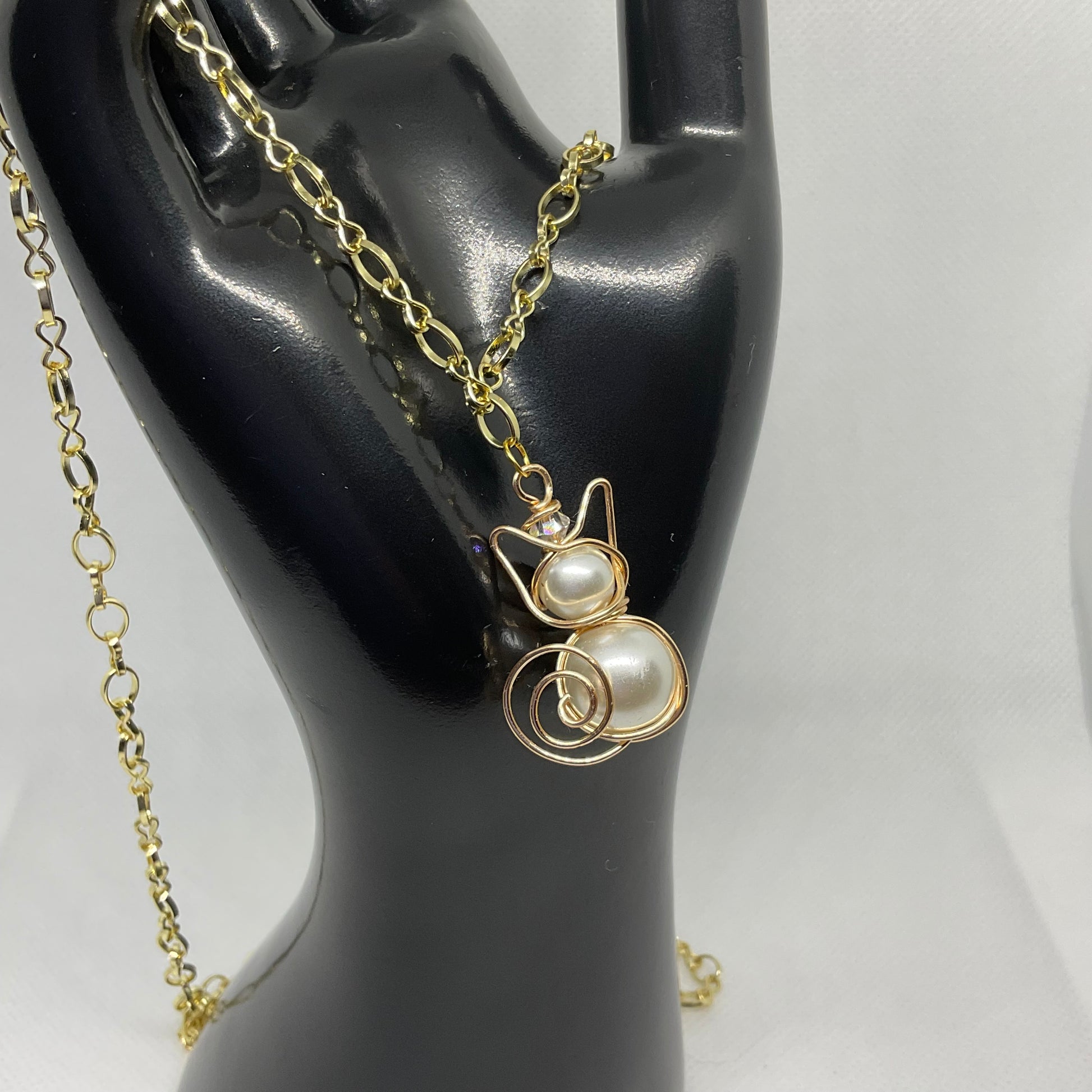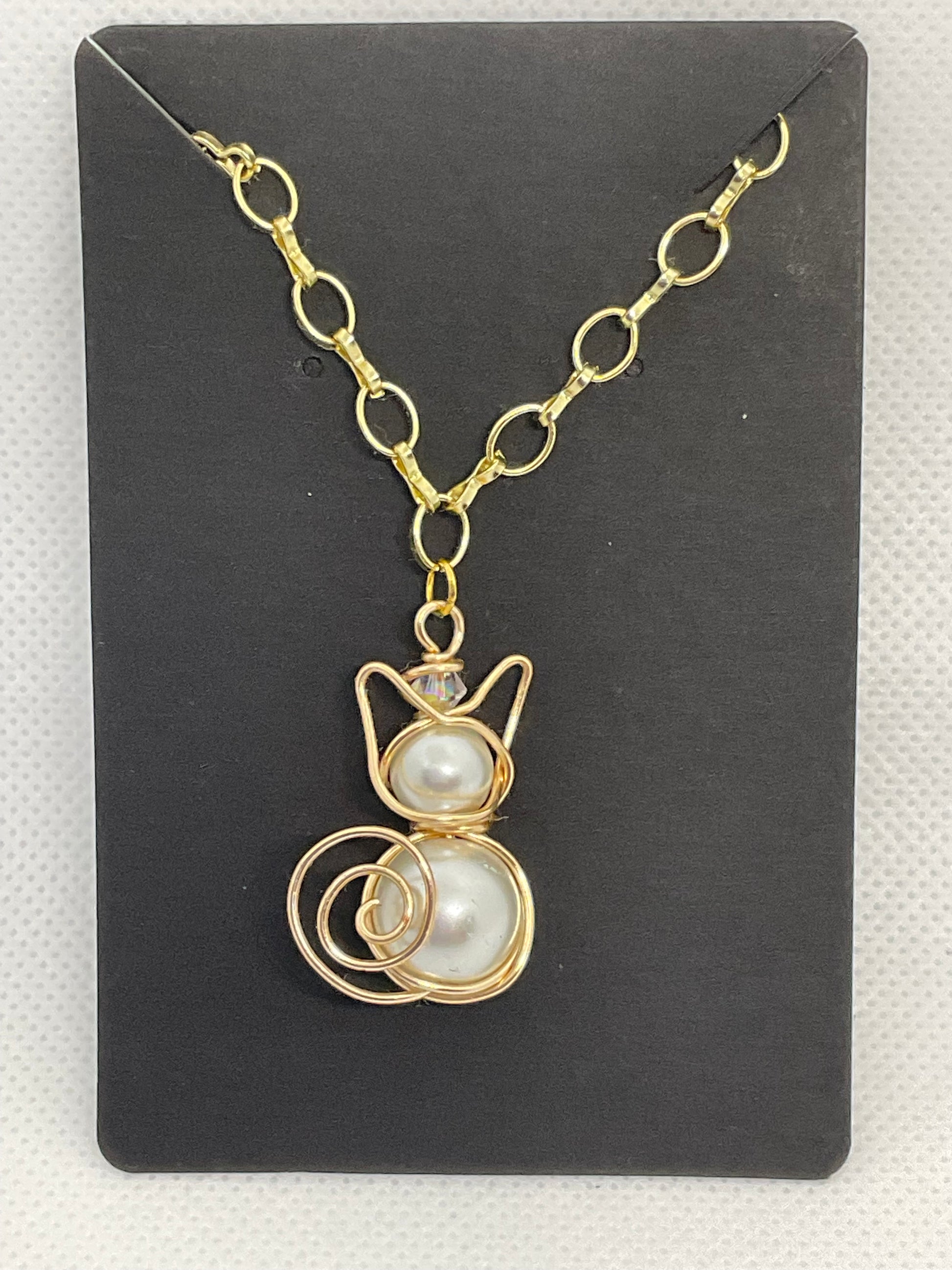 Artisan cat necklace features sophisticated design style, with white pearl and gold wire. This beautiful cat pendant rests on a gold finished chain with extension and lobster clasp closure. It is adorned with a stunning Swarovski Crystal.