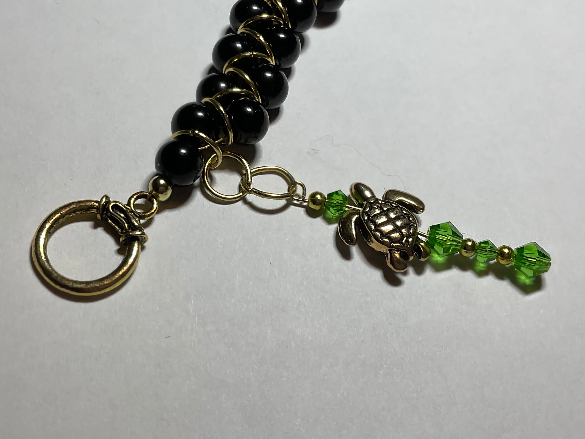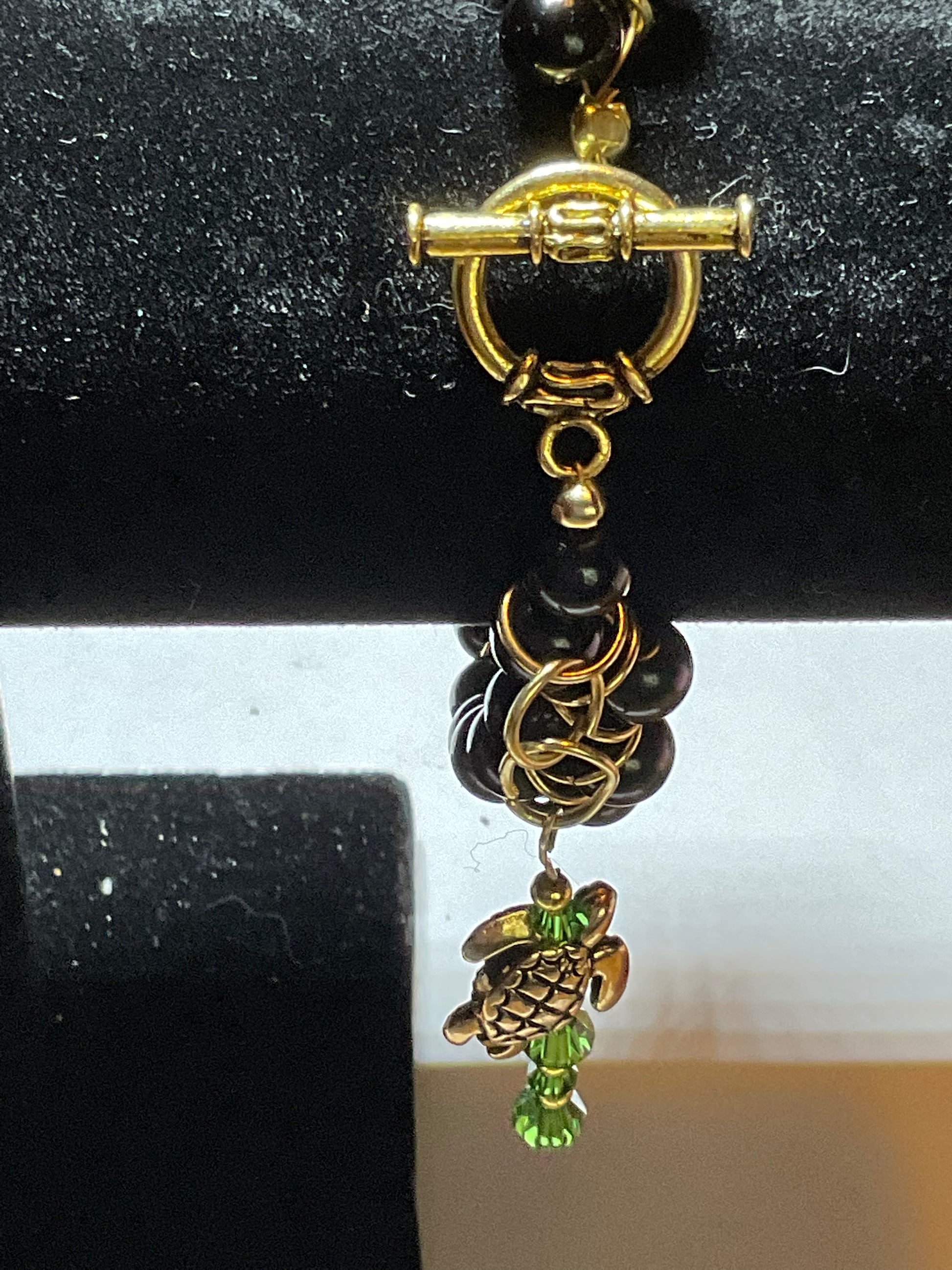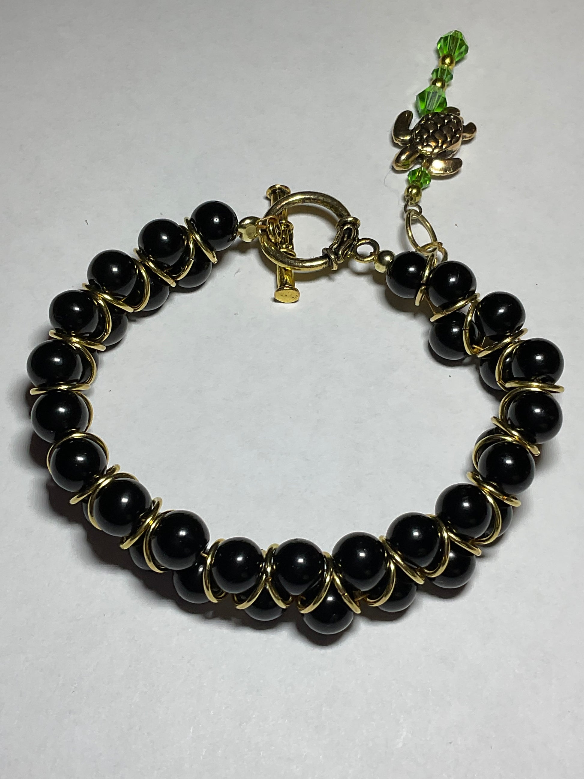 Handmade Black glass pearl 18kt gold plated Goddess Bracelet with a gold plated sea turtle and peridot crystals 2 1/2 inch dangle. This beautiful bracelet measures 8 1/2 inches long it can be shortened or lengthened upon request. This bracelet goes with any outfit & makes a perfect gift! Other colors available just send an email to me with your preferences. Thank you for visiting my store and looking come back to see new jewelry often! All orders come in a gift box and wrapped in ribbon.
