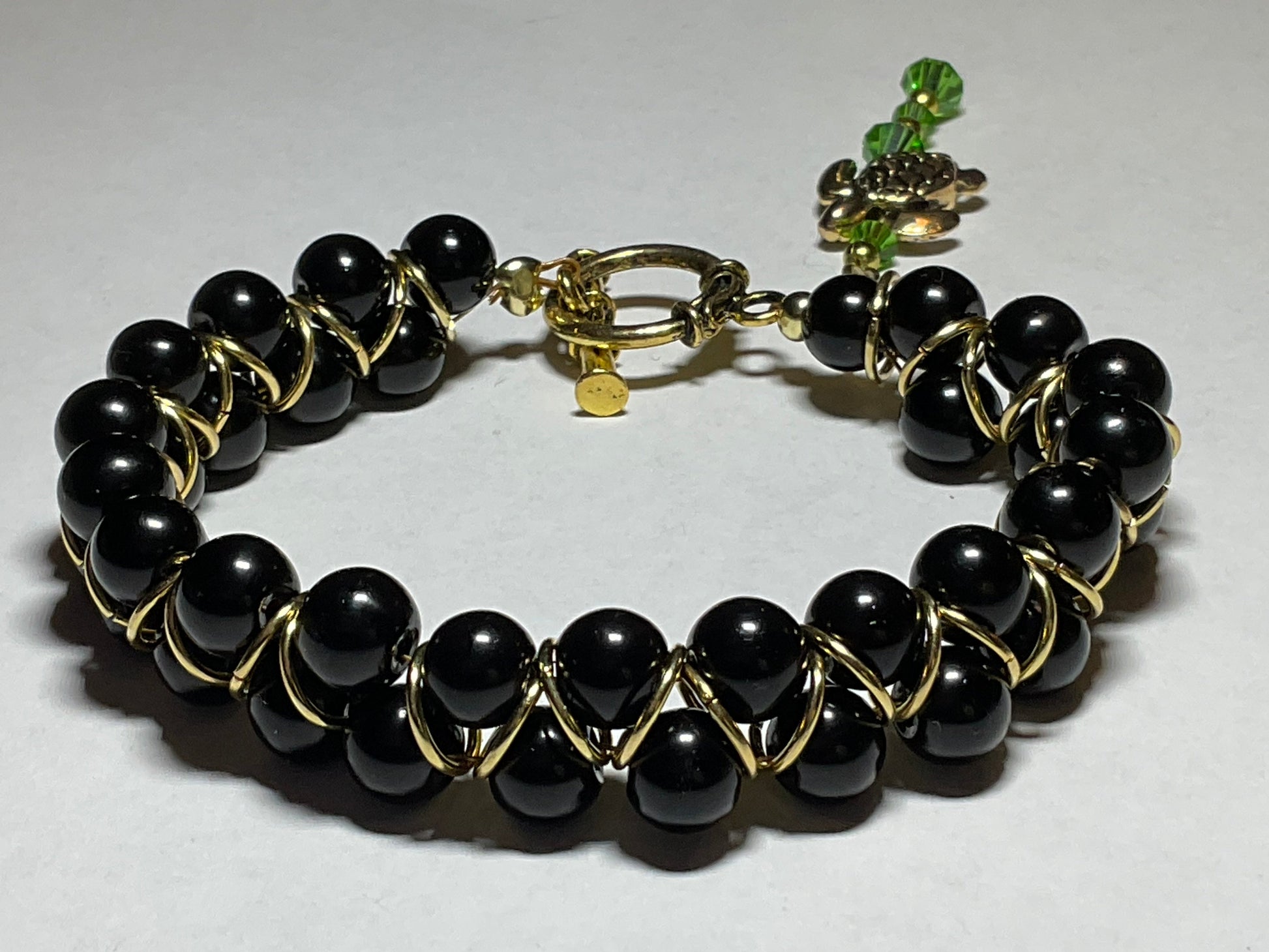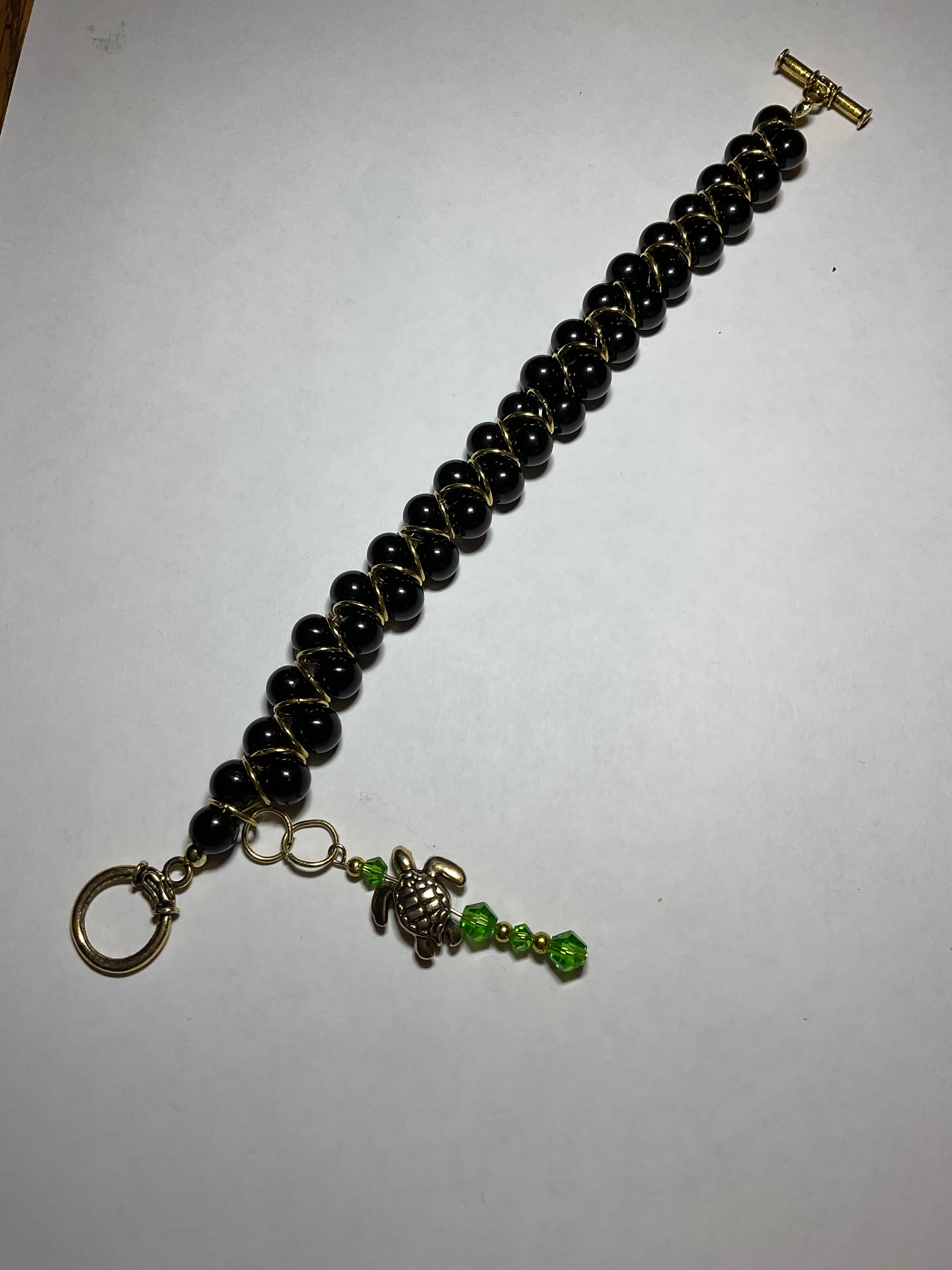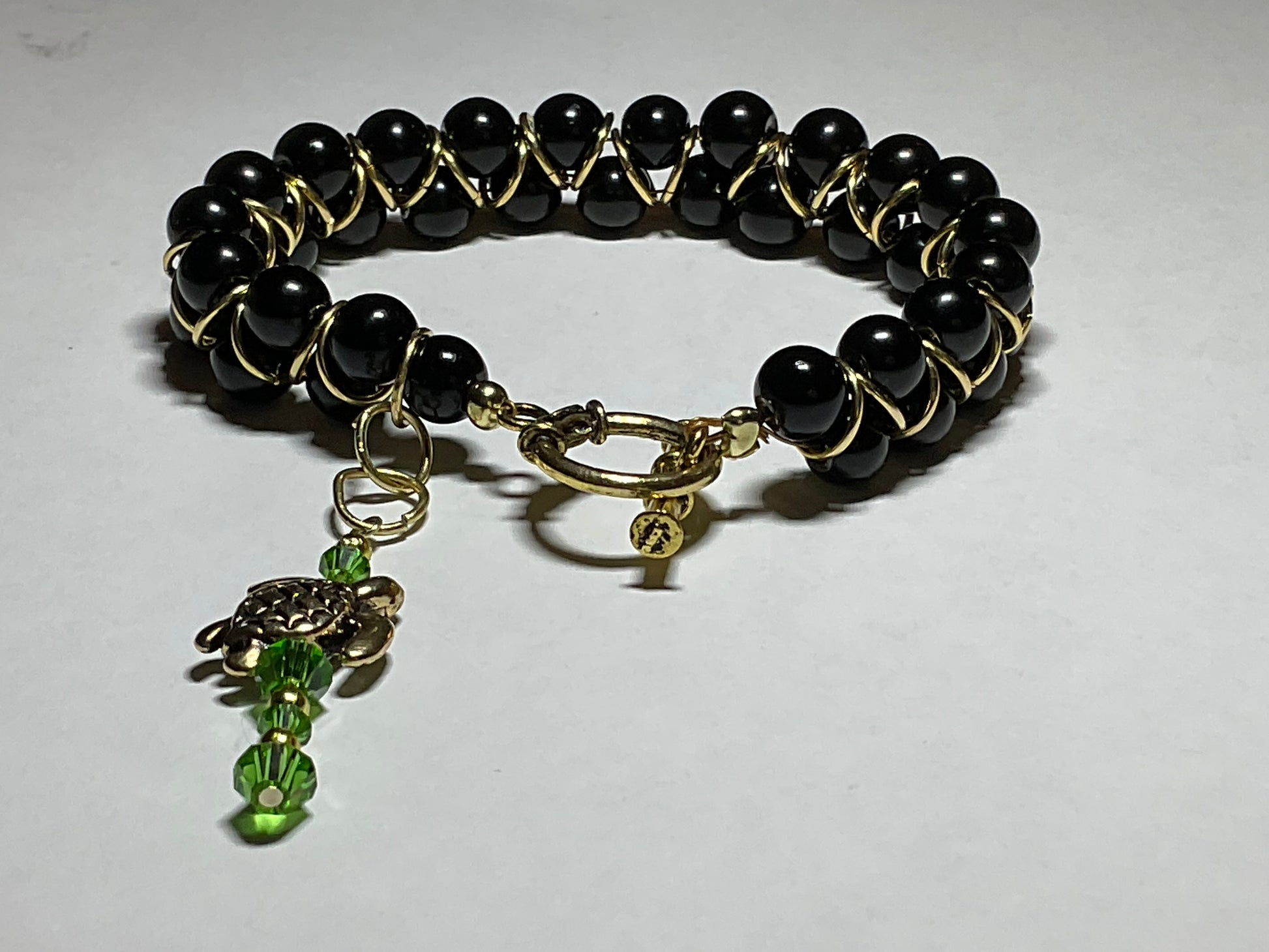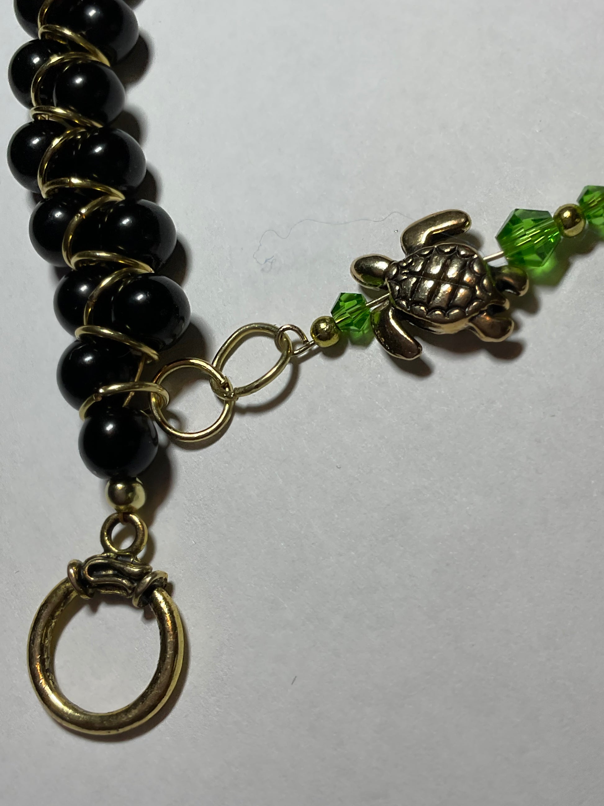Handmade Black glass pearl 18kt gold plated Goddess Bracelet with a gold plated sea turtle and peridot crystals 2 1/2 inch dangle. This beautiful bracelet measures 8 1/2 inches long it can be shortened or lengthened upon request. This bracelet goes with any outfit & makes a perfect gift! Other colors available just send an email to me with your preferences. Thank you for visiting my store and looking come back to see new jewelry often! All orders come in a gift box and wrapped in ribbon.