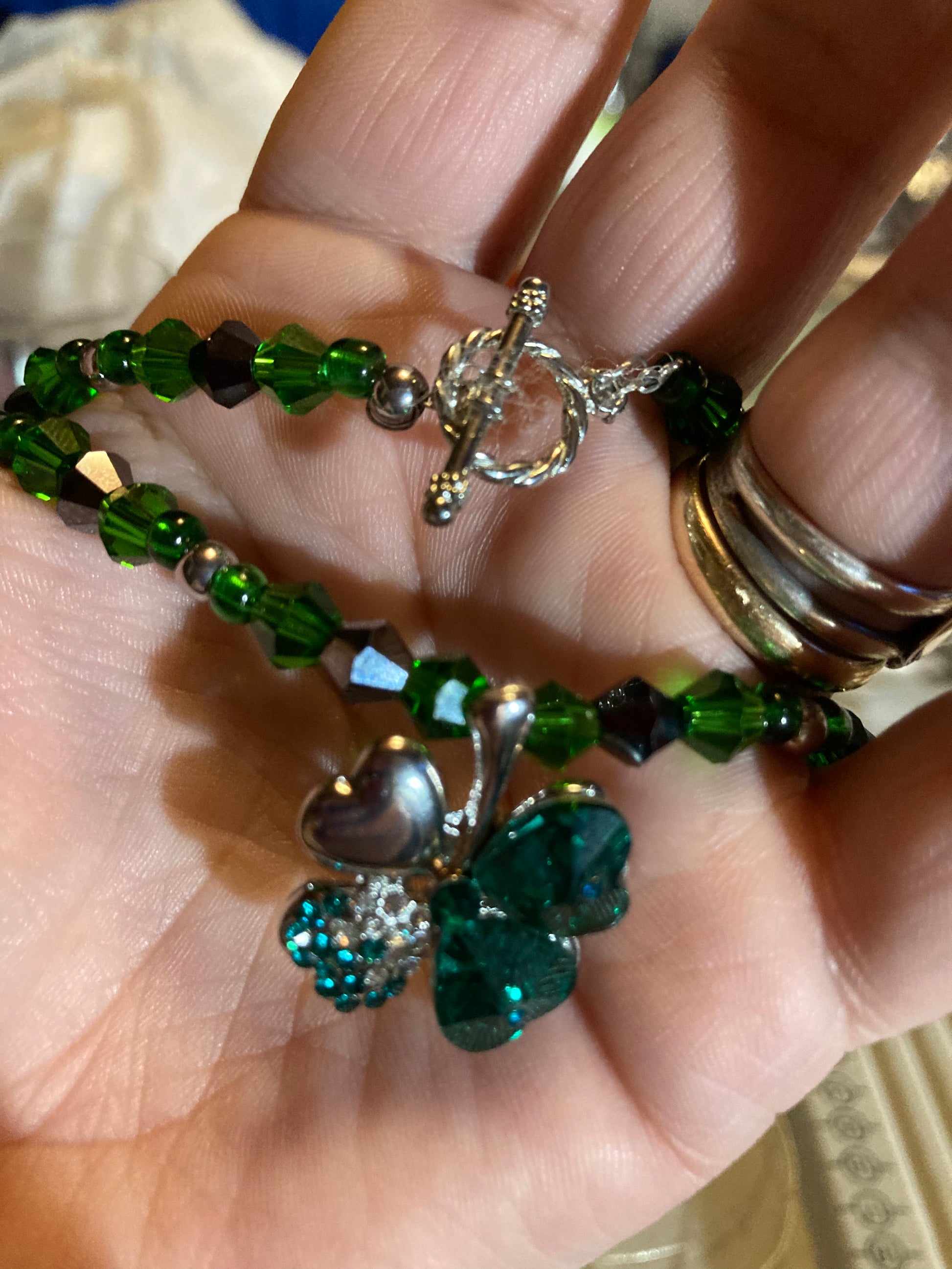Handmade in Michigan, USA, Silver Alloy 4 Leaf clover with Genuine Emerald green Crystals, Crystals, Jet black Crystals, adorned with metal alloy silver round beads and green silver lined seed beads. This necklace measures 18 inches long end to end. This necklace comes with a metal alloy toggle clasp for easy on and off. Thank you for looking, & visiting my site! All orders come gift boxed and wrapped in ribbon. Please come back often, new jewelry added frequently.