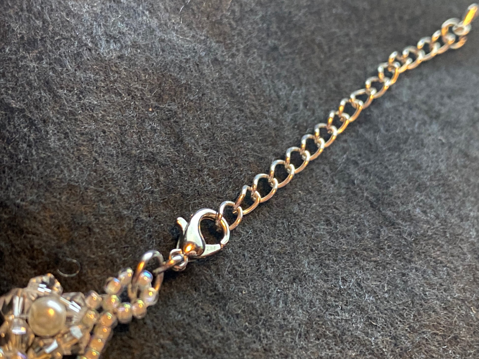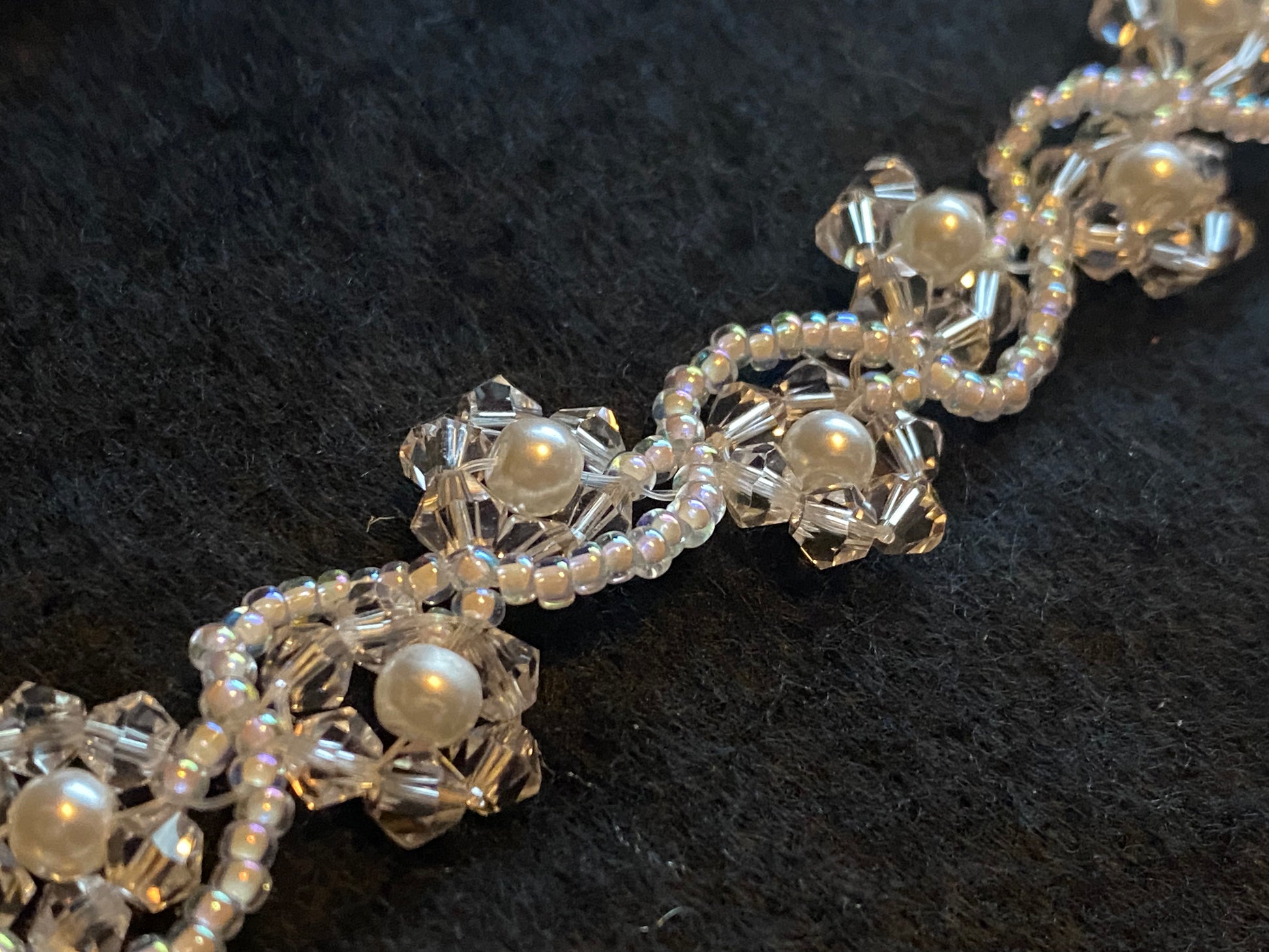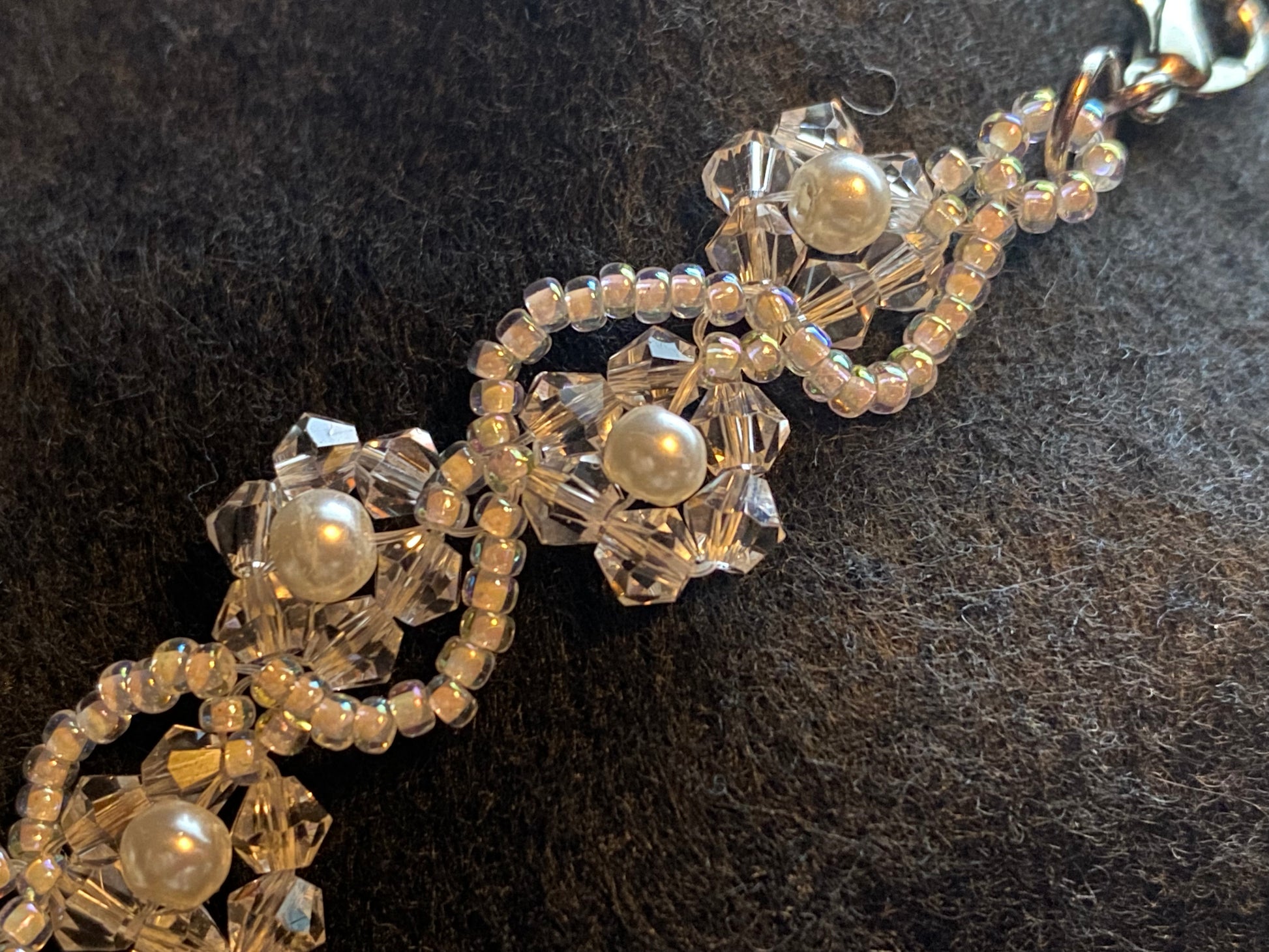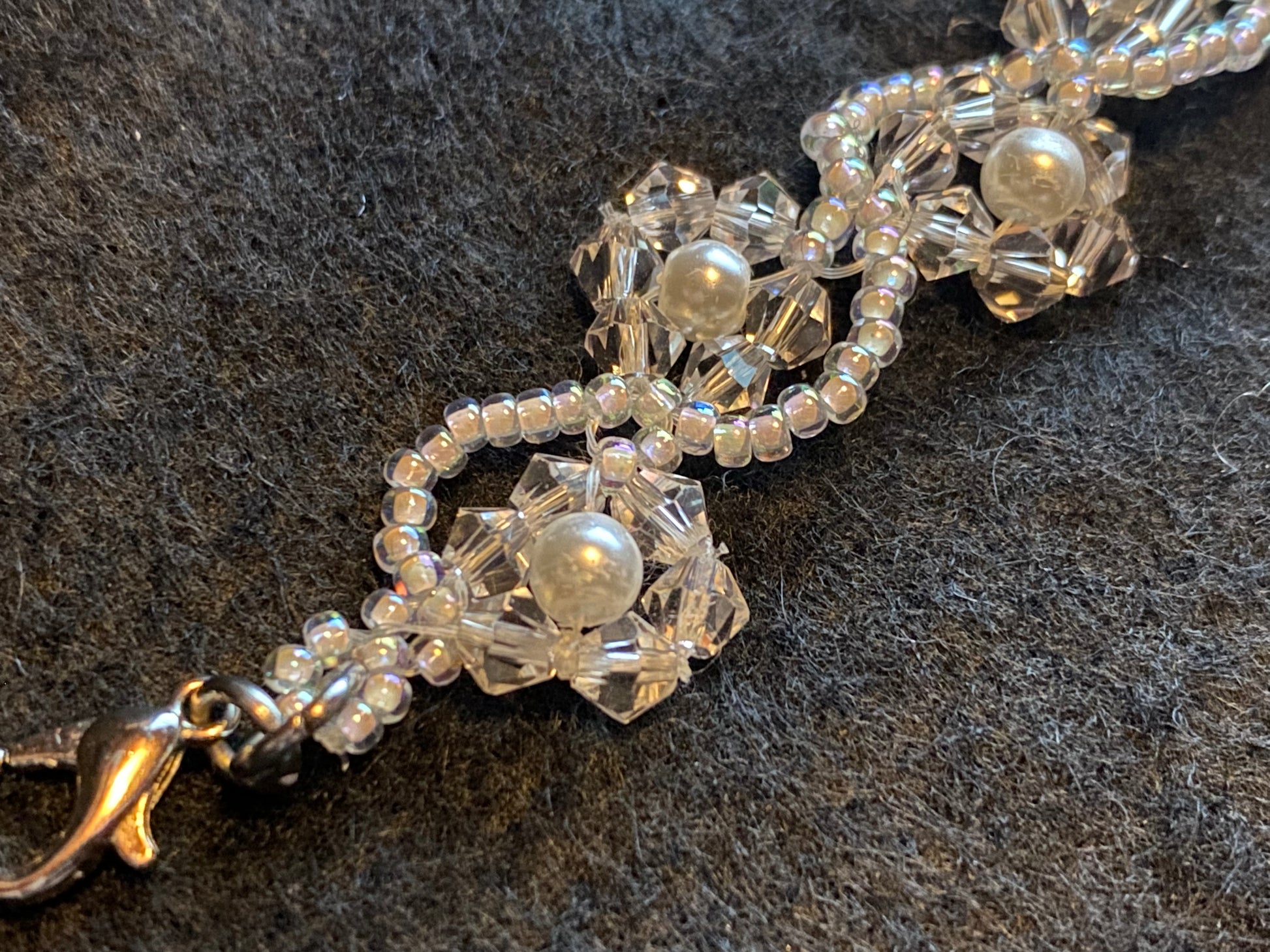 Glistening and sparkling like fallen snow this bracelet is gorgeous! Exceptionally beautiful with clear crystals, irredecent white glass seed beads and white glass pearls this bracelet is perfectly paired with snowflake earrings also offered on this site, or as a stand alone bracelet. Make it a Surprise gift for a bride on her wedding day she will treasure! Bracelet includes a stainless steel lobster clasp as well as an extension chain to adjust to fit most. Stainless steel is reportedly hypoallergenic for most people. No need to wrap! Comes in white gift box! Free! Thank you for visiting my site!