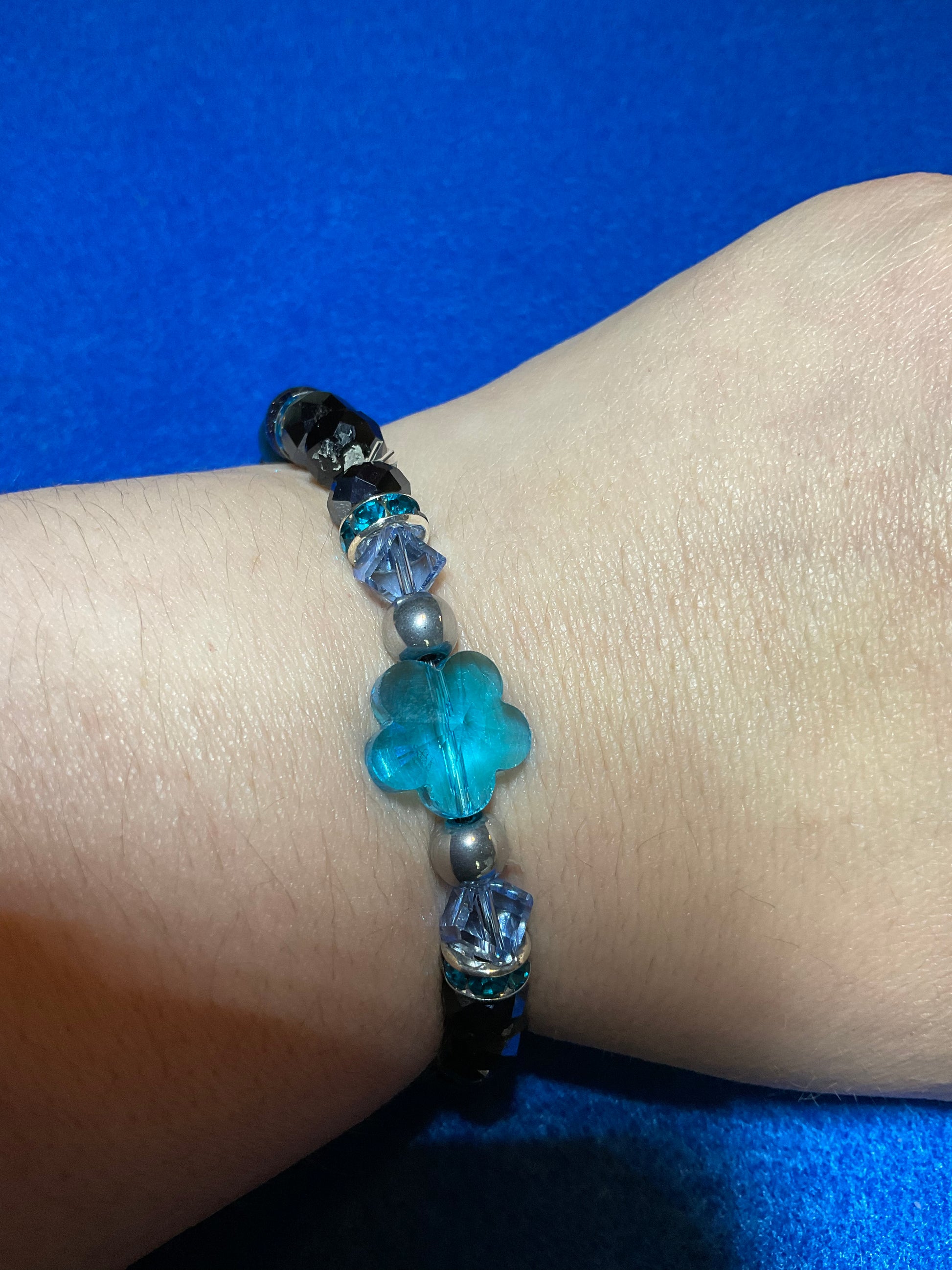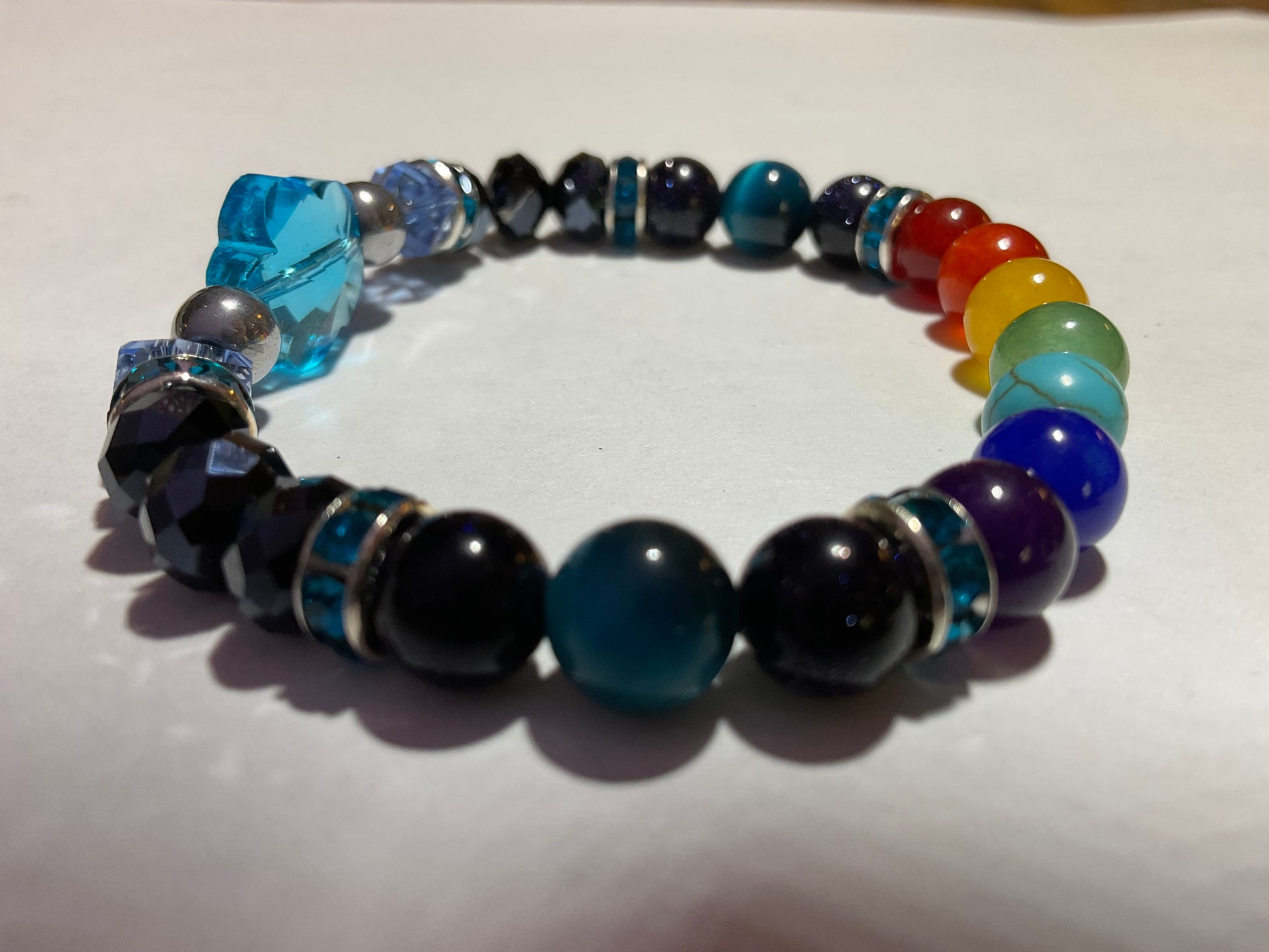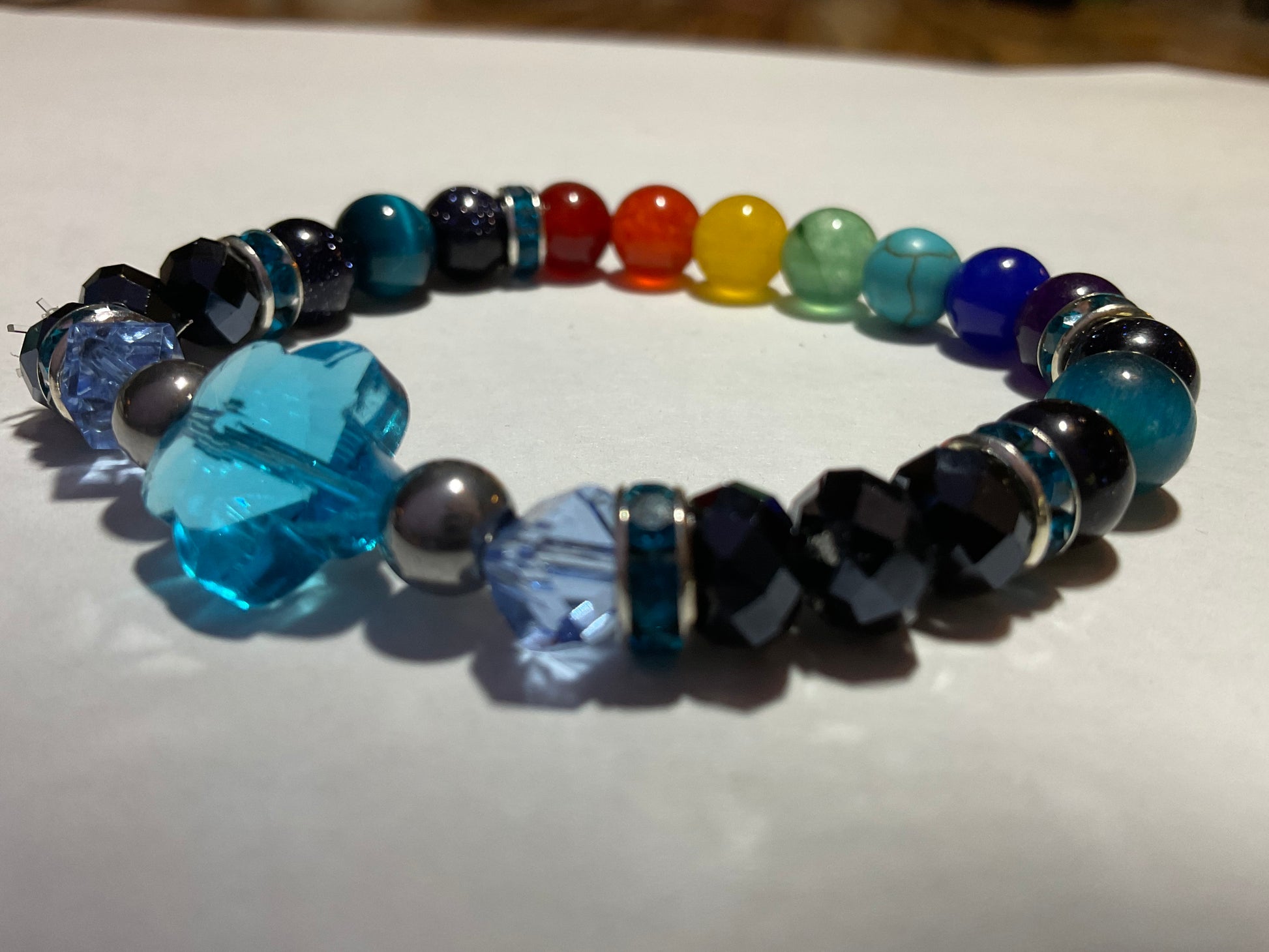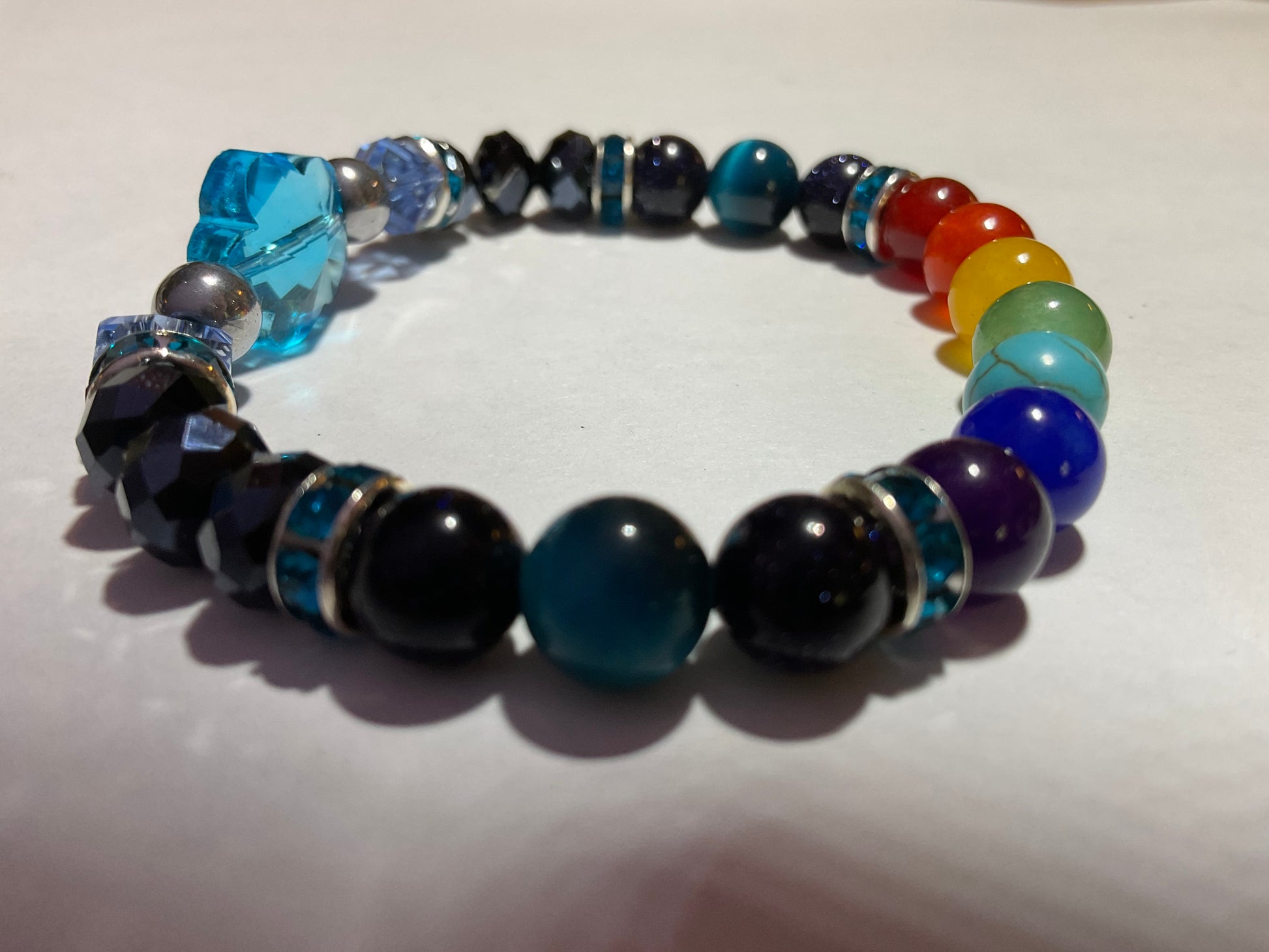 Lake Blue crystal flower approximately 0.5 in x 0.5 in, light blue corner cut cubes,,blue tigers eye, sparkling blue goldstone, Blue rhinestone spacers , jet black crystal s, and healing chakra stones all in this trendy bracelet. Bracelet measures approximately 7 3/4 inch’s around and is stretchy to fit most. Thank you for looking, & visiting my site! All orders come gift boxed and wrapped in ribbon.