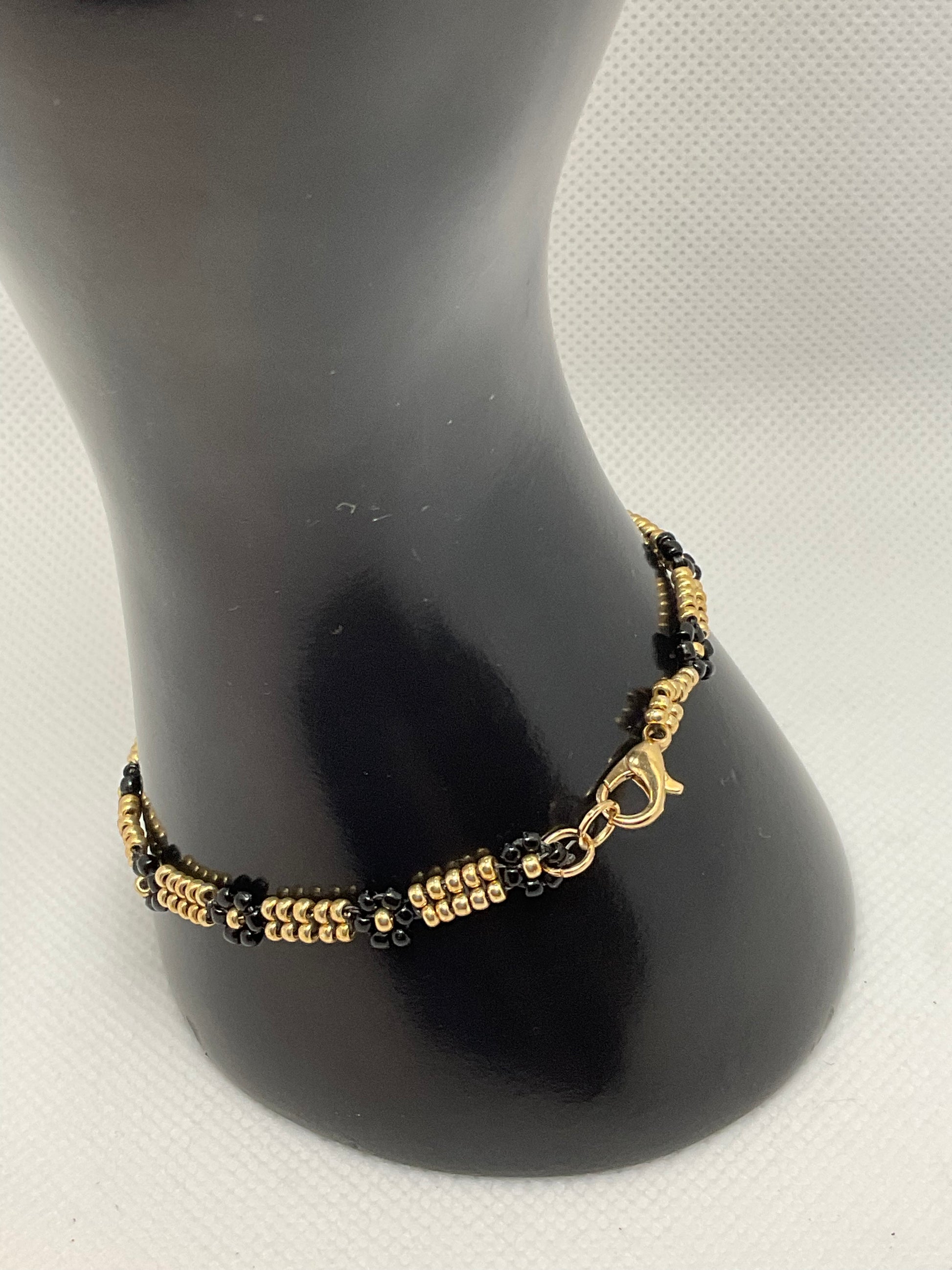 Black and gold seed bead herringbone bracelet with gold plated stainless steel lobster clasp.