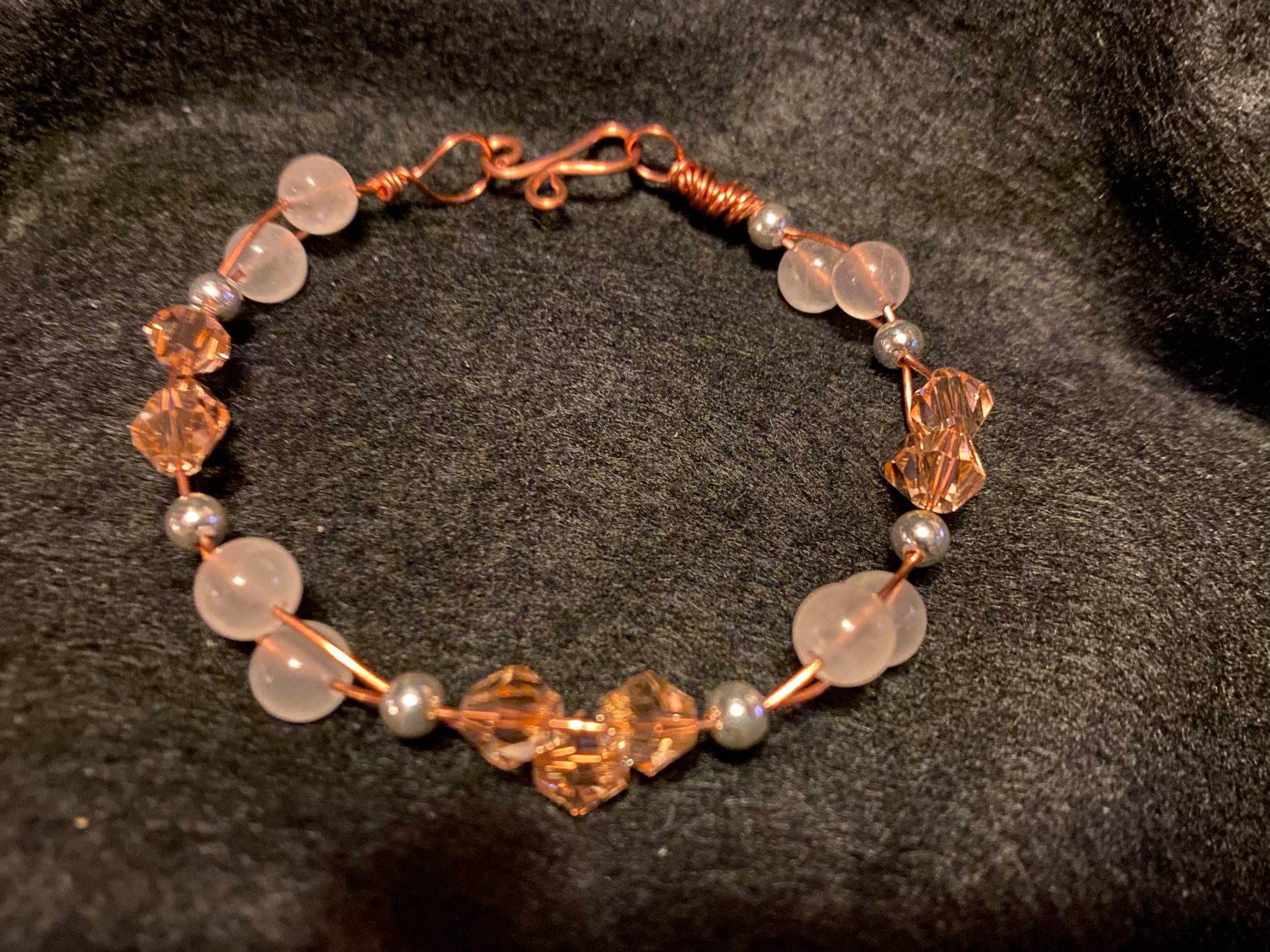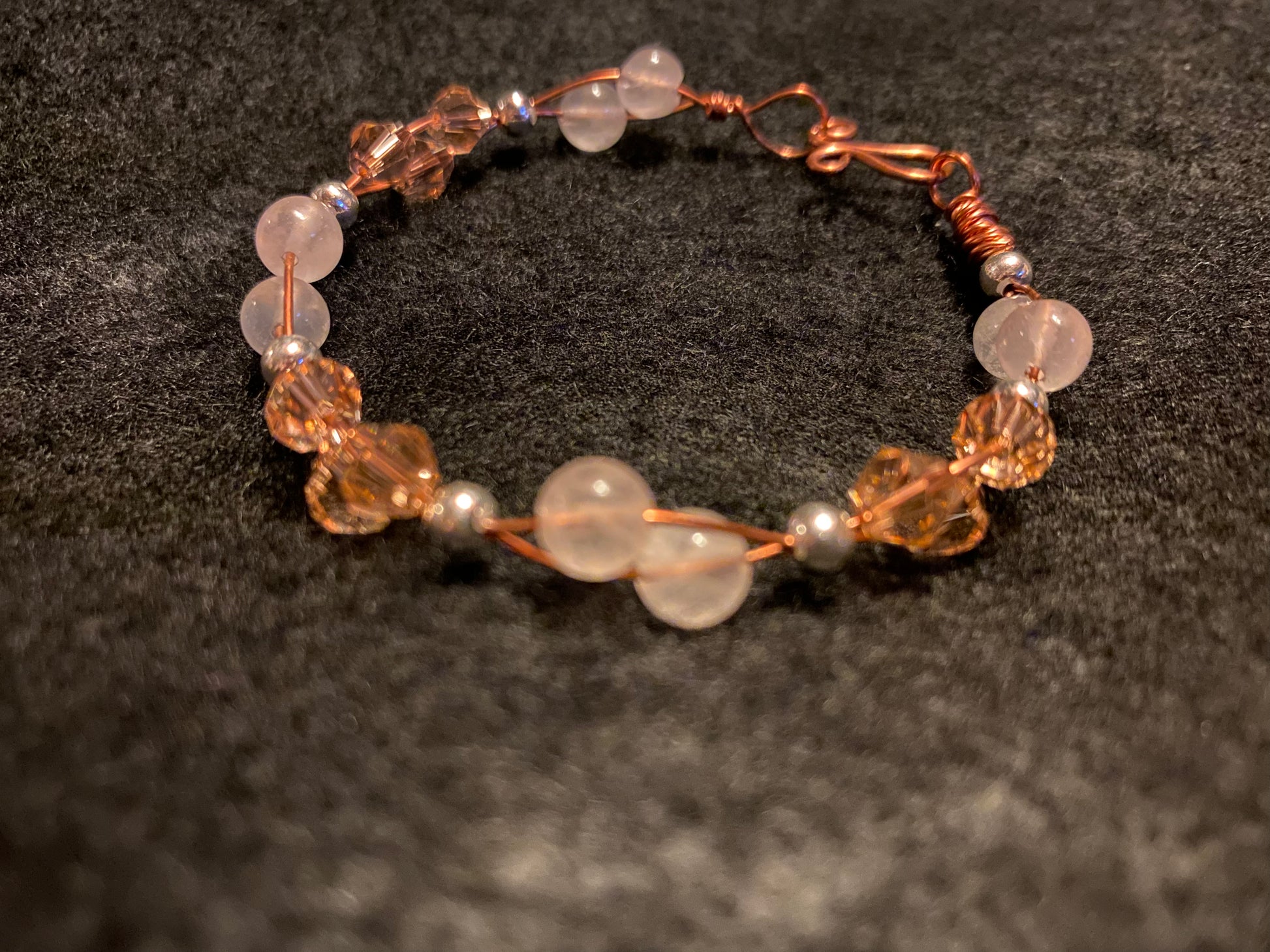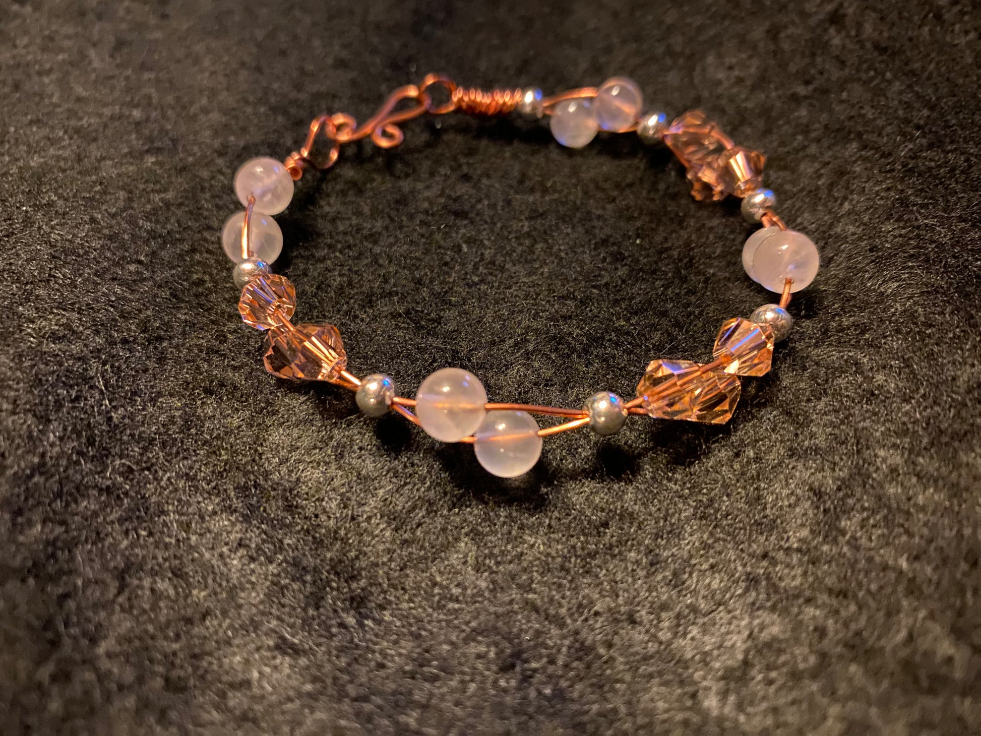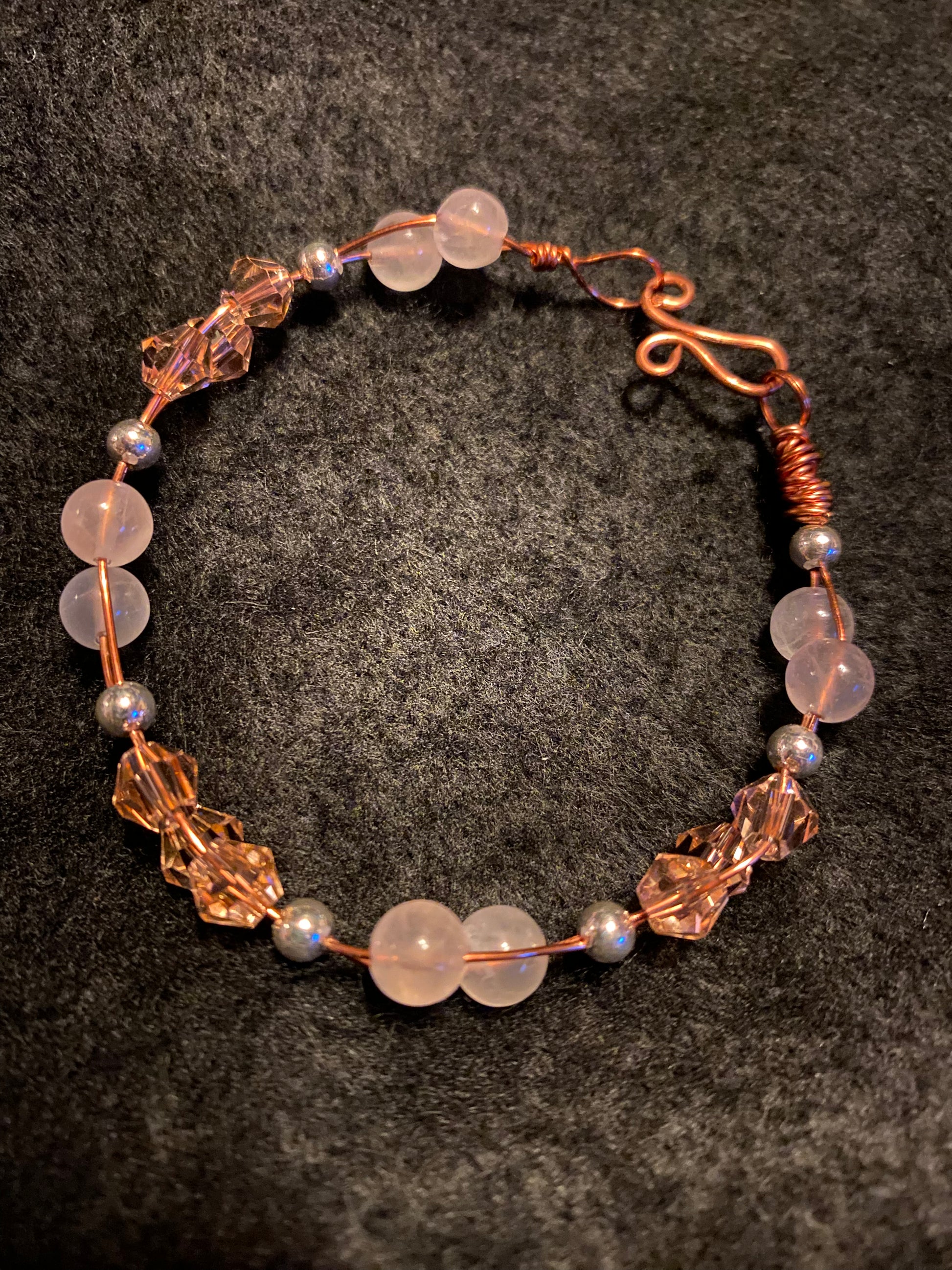 The light pink semiprecious gemstone Rose quartz is known as the Heart stone or love and romance stone, symbolizing unconditional everlasting love, it brings calm, trust, peace, and is said to allow love, for one’s self and for others. Also this Bare Copper Bracelet has Sterling Silver accent beads and Authentic Sparkling Crystals. The bracelet has about a 6 1/2” inner diameter. If another size is needed please contact me via my email and I will be happy to customize a bracelet to fit your needs. Thank you for visiting my site!
