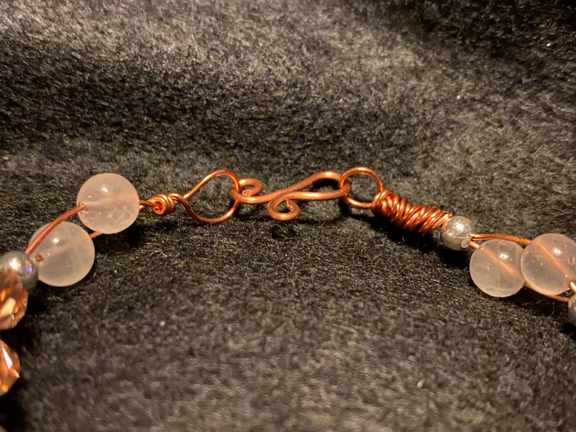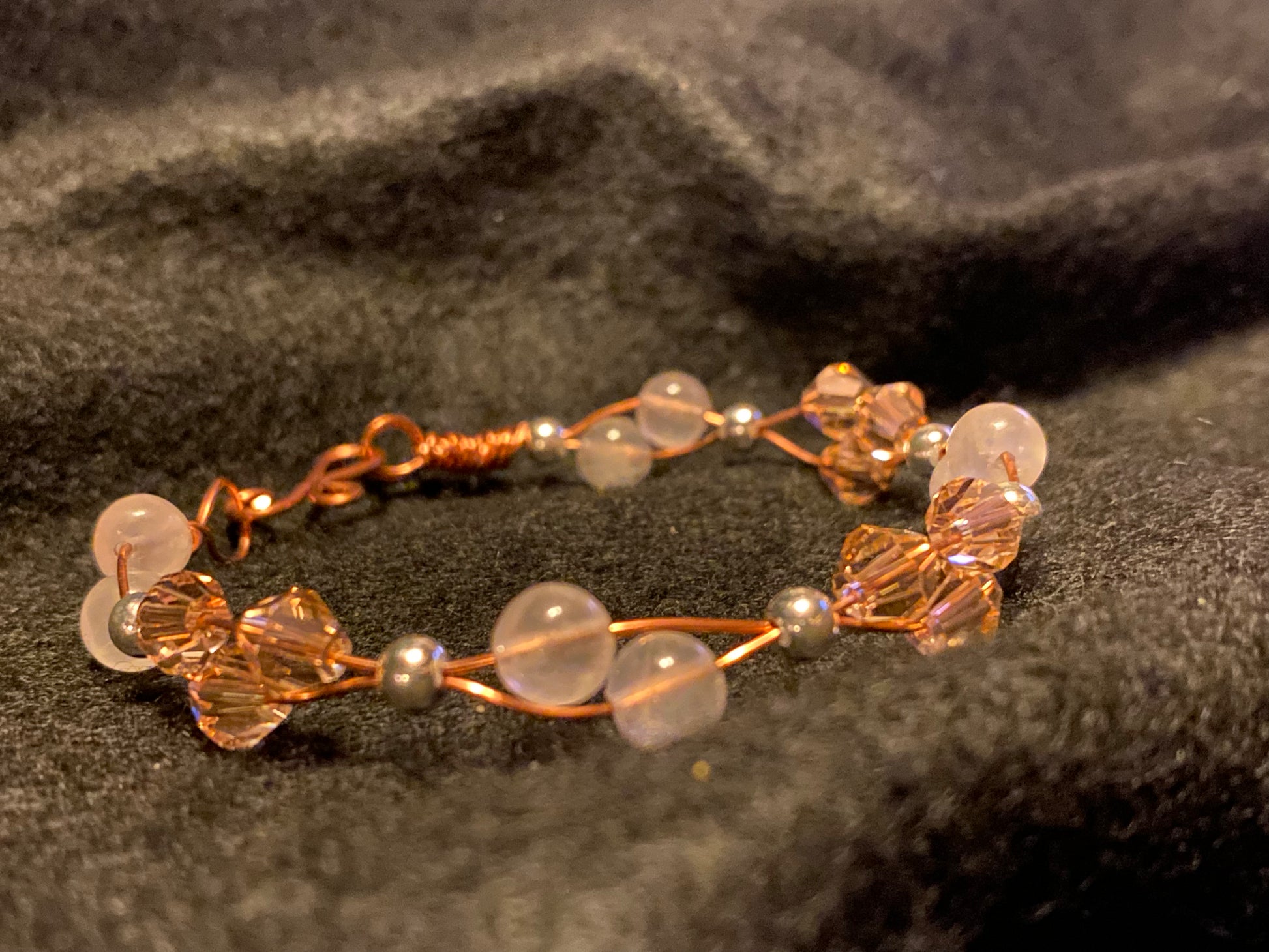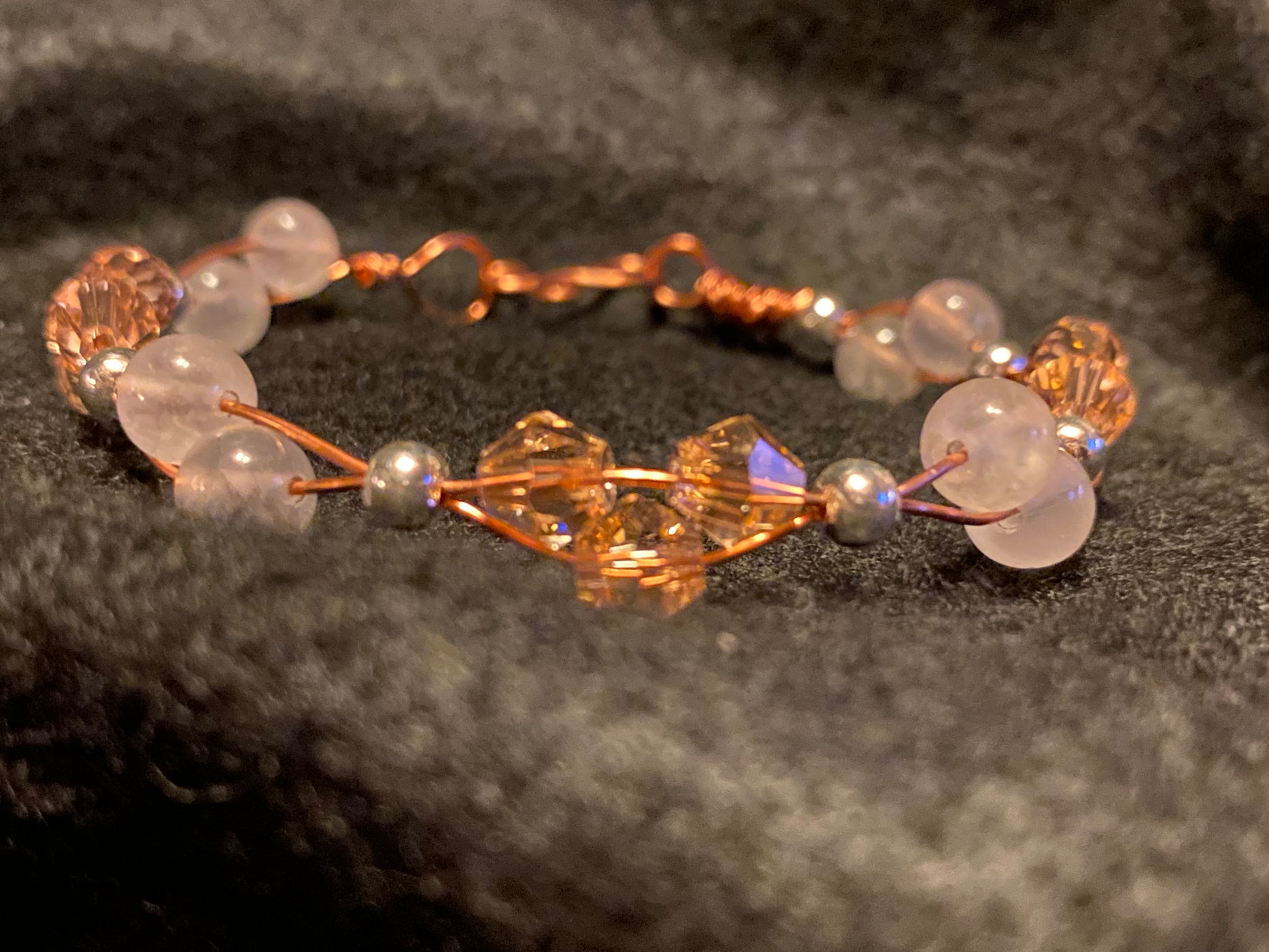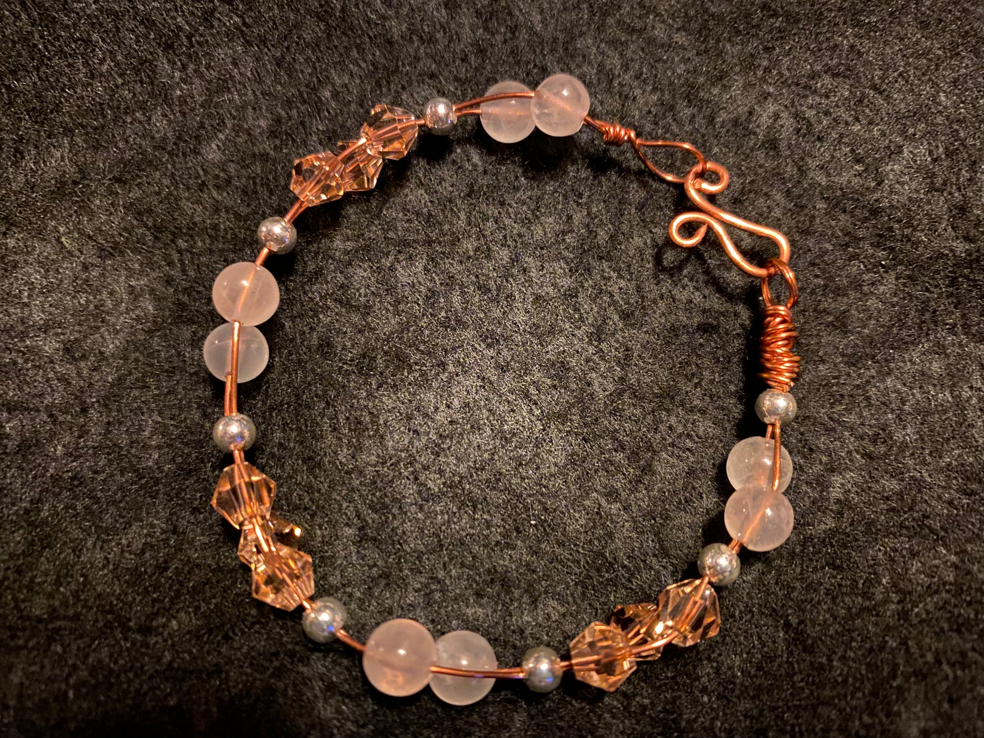 The light pink semiprecious gemstone Rose quartz is known as the Heart stone or love and romance stone, symbolizing unconditional everlasting love, it brings calm, trust, peace, and is said to allow love, for one’s self and for others. Also this Bare Copper Bracelet has Sterling Silver accent beads and Authentic Sparkling Crystals. The bracelet has about a 6 1/2” inner diameter. If another size is needed please contact me via my email and I will be happy to customize a bracelet to fit your needs. Thank you for visiting my site!