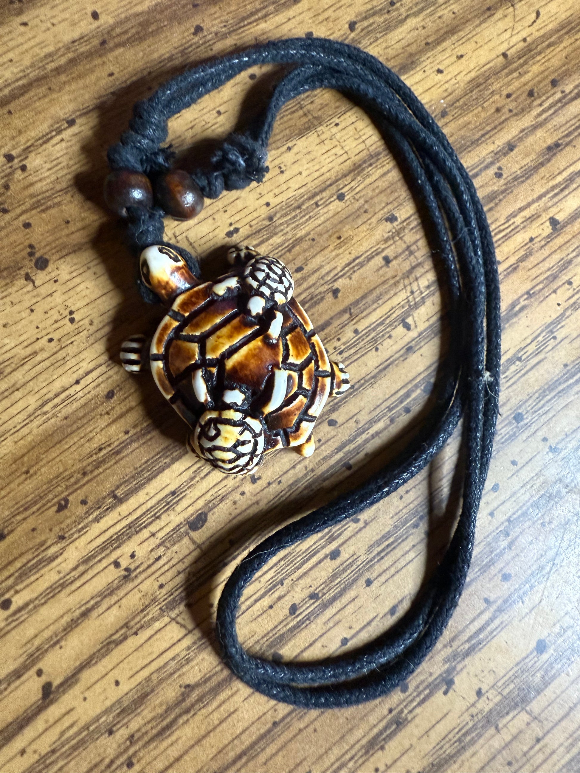 Acrylic Turtle corded necklace featuring a turtle pendant with two little turtles on the turtles back. Adjustable size