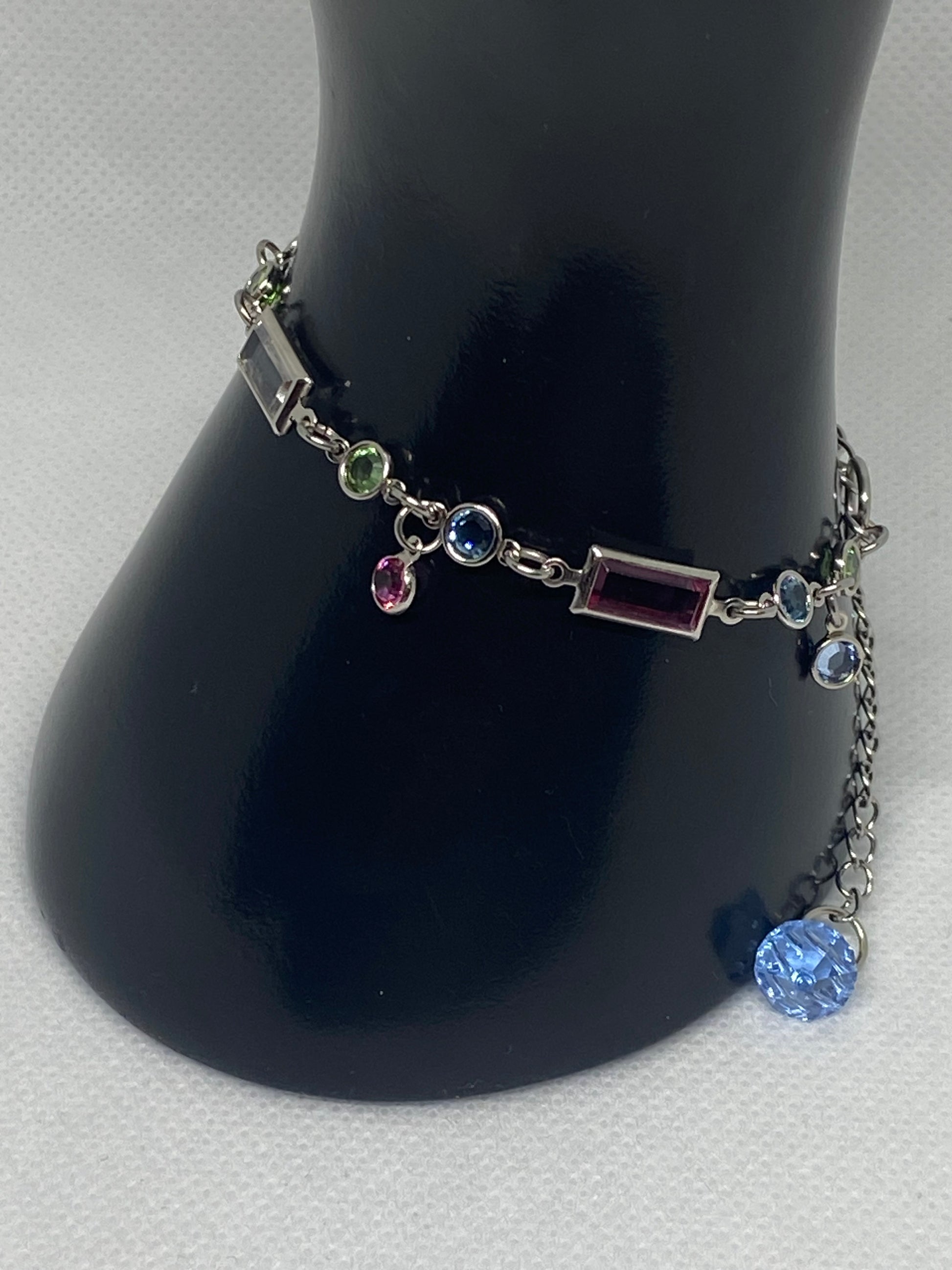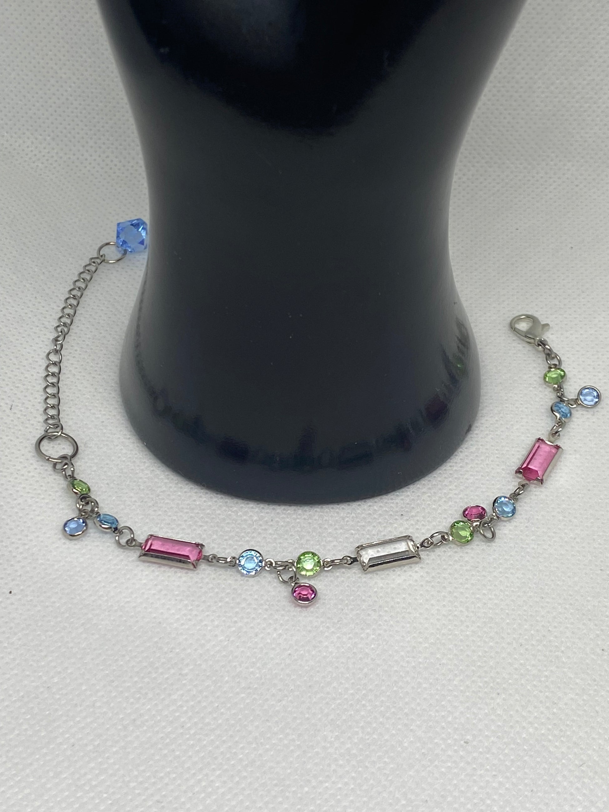 "Indulge in luxury with the Dainty Pastel Swarovski Crystal Handmade Bracelet. Handcrafted with vintage Swarovski crystals, this unique one of a kind silver bracelet showcases a variety of elegant crystal links and drops, including light sapphire blue, light green, and Siam ruby (pink). With an adjustable length this limited edition bracelet is the perfect accessory for any occasion. Your bracelet will arrive beautifully gift boxed."