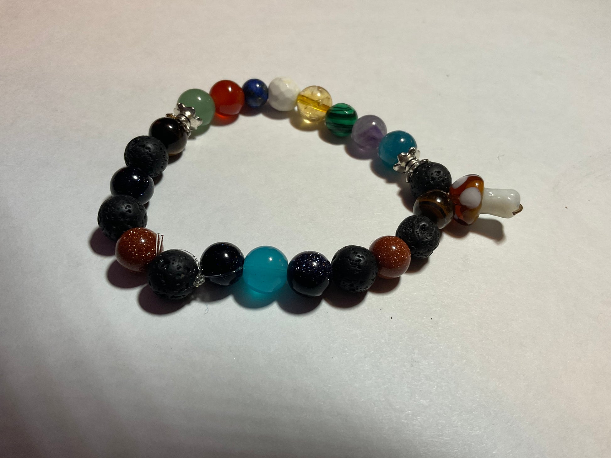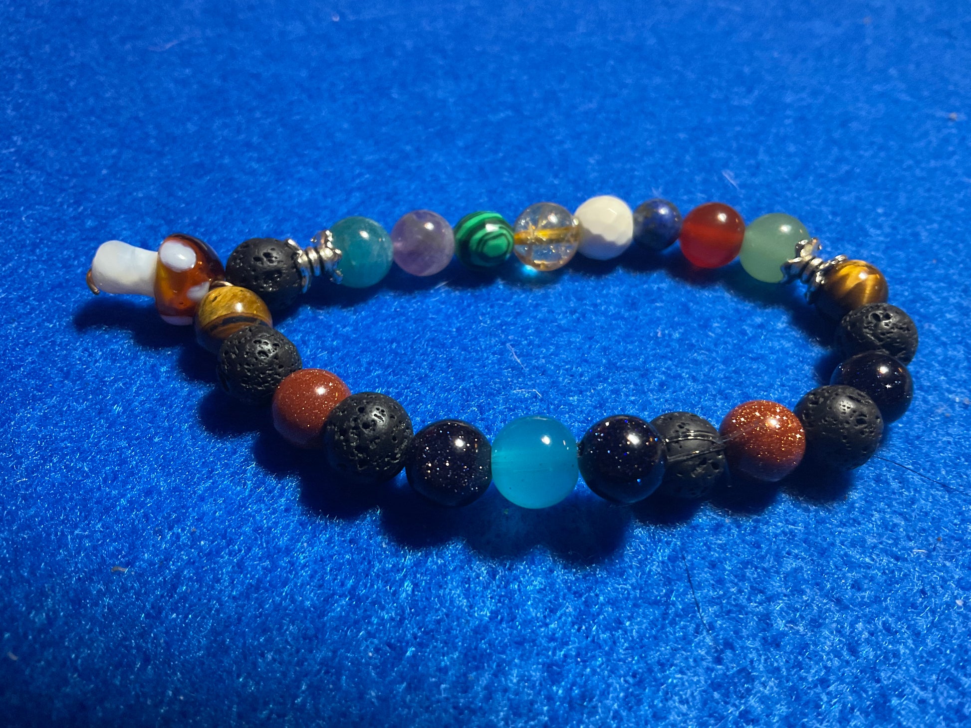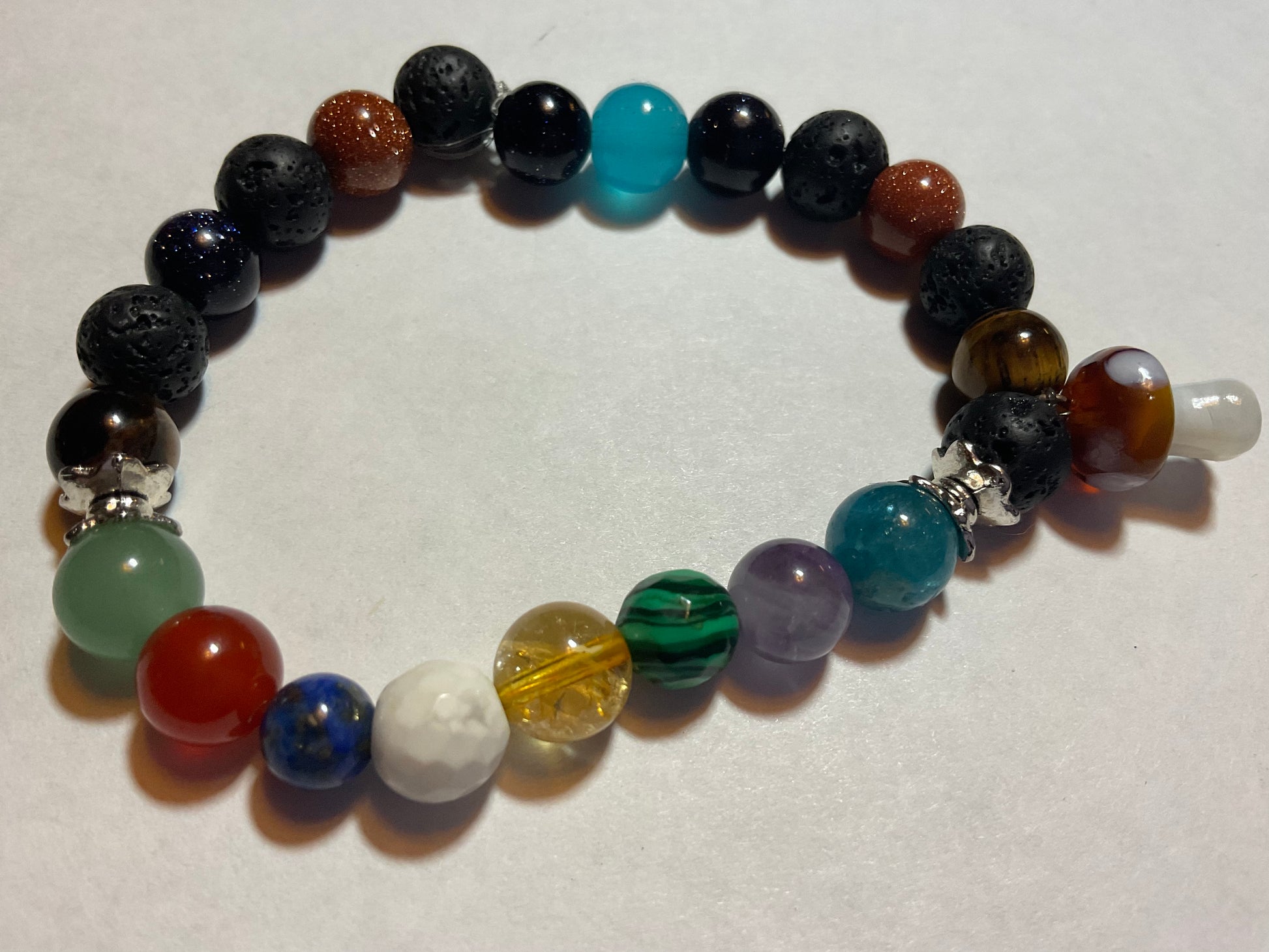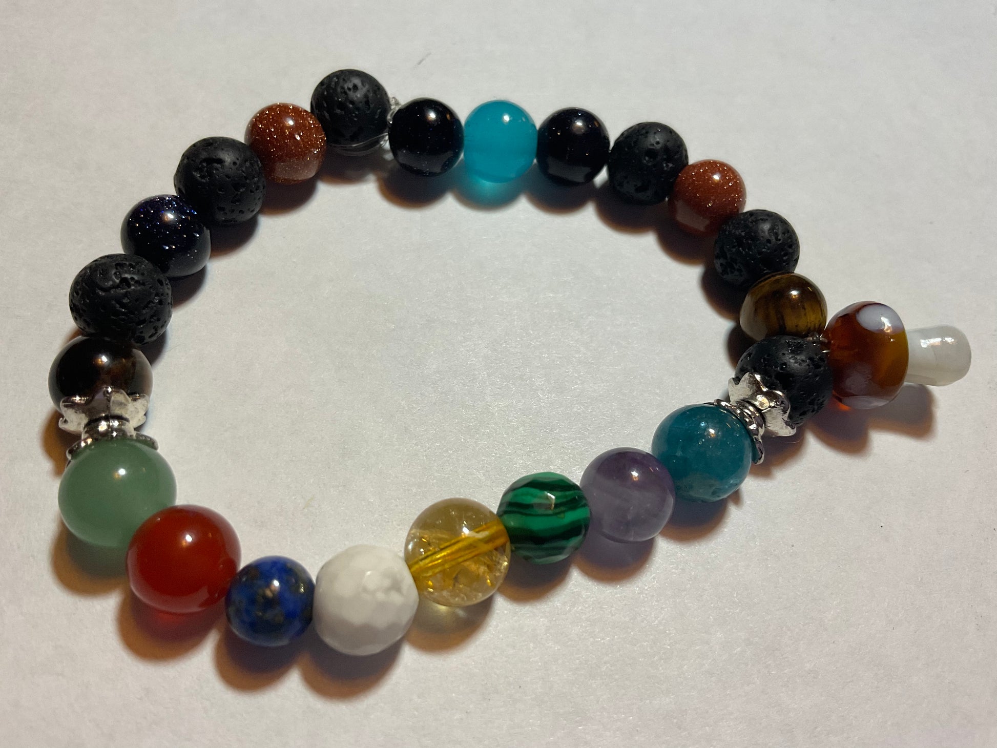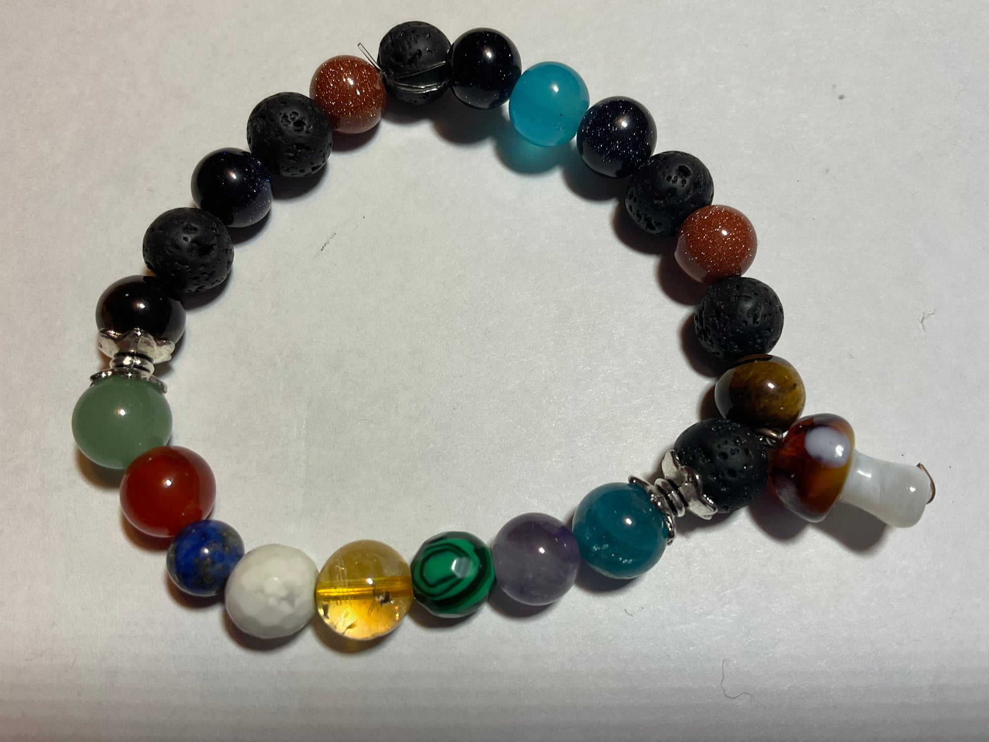 Goldstone, Blue Goldstone, Black Lava rock,Aquamarine,Amethyst, Malachite ,Citrine, Howlite, Carnelian, & Aventurine, featuring a mushroom charm dangling from the bracelet. It measures 7 3/4 inches around and is elastic so one size fits most. .Thank you for looking, & visiting my site! All orders come gift boxed and wrapped in ribbon.