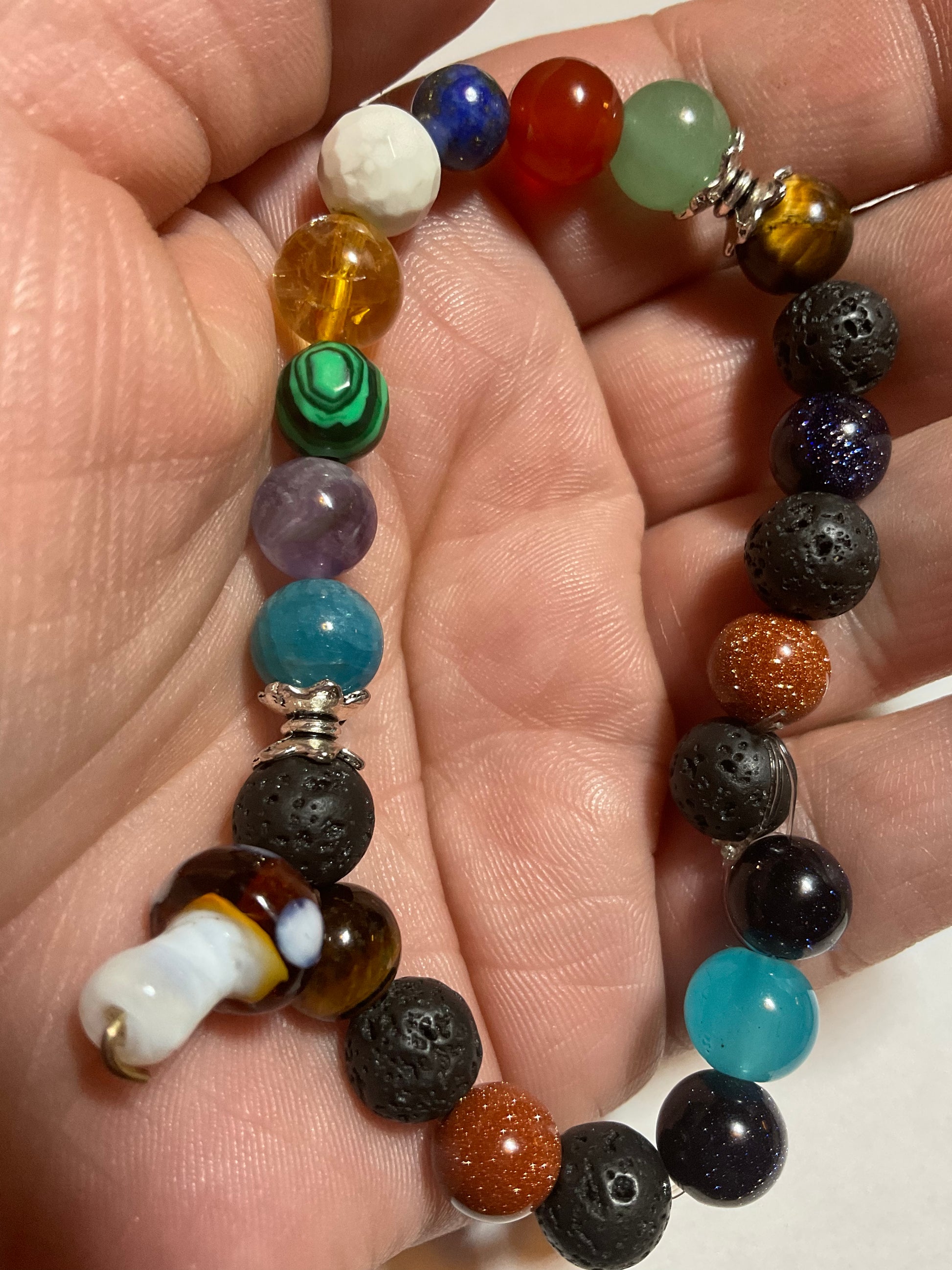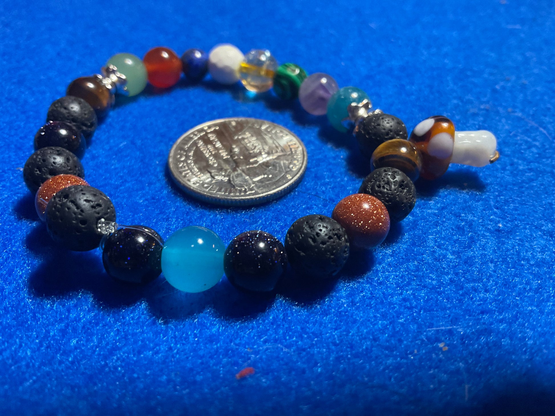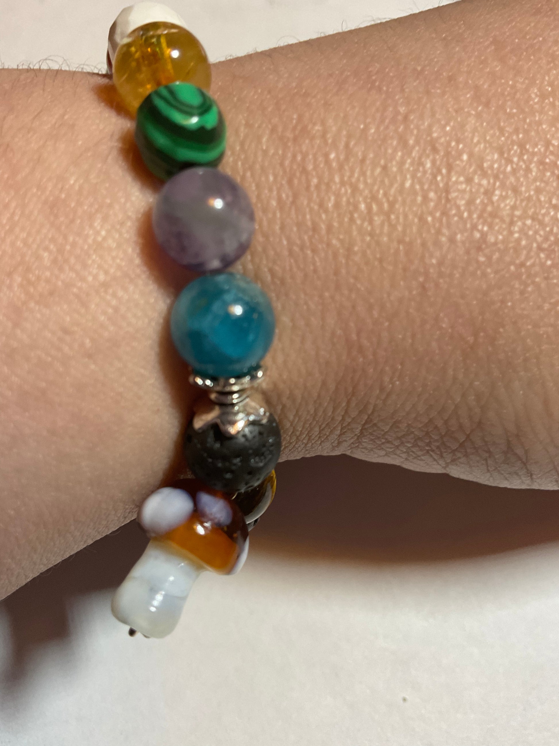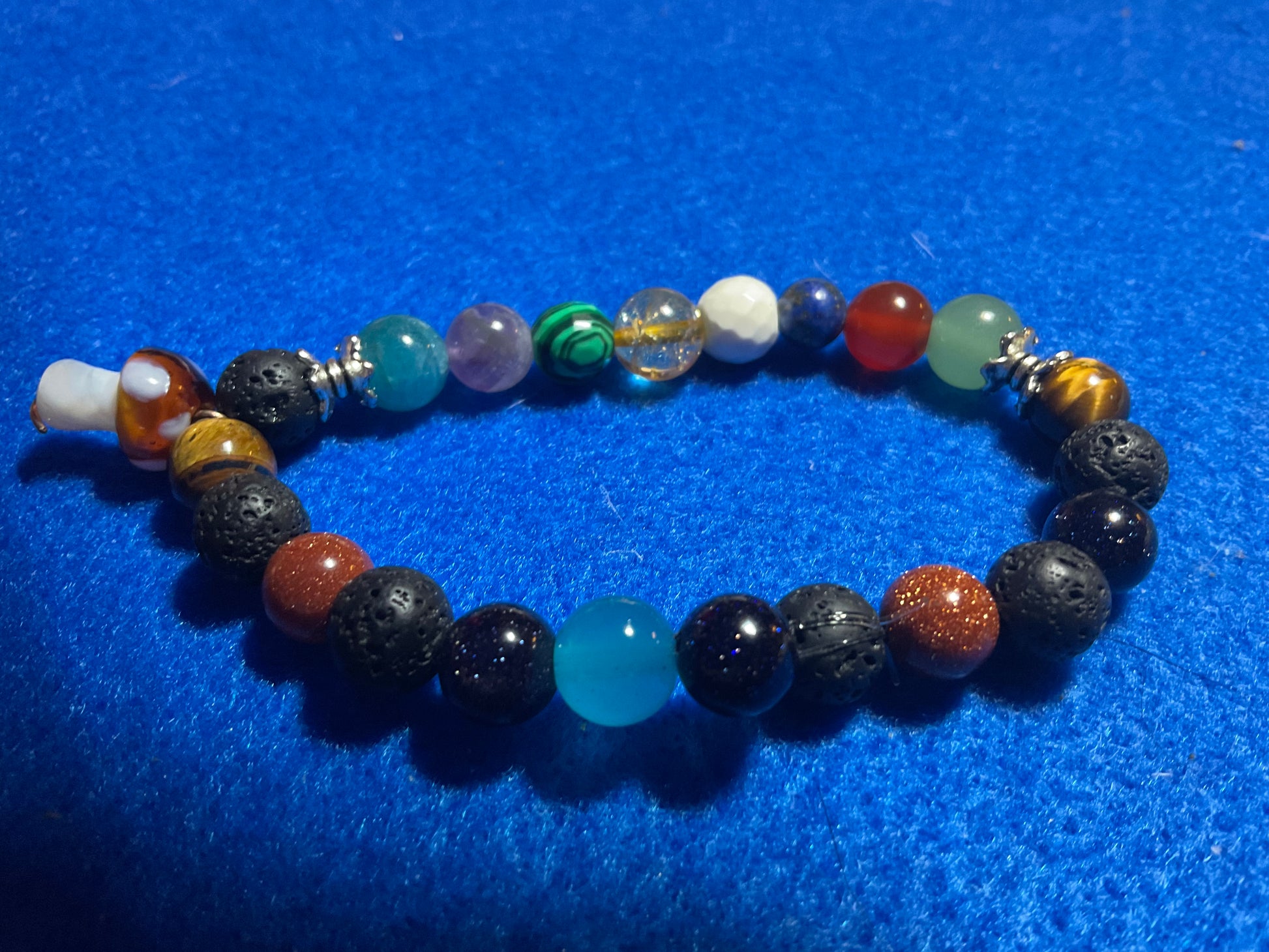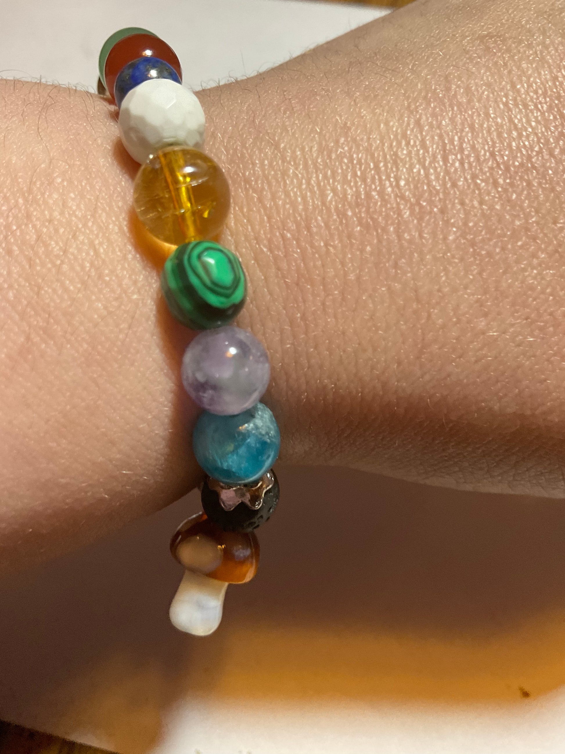 Goldstone, Blue Goldstone, Black Lava rock,Aquamarine,Amethyst, Malachite ,Citrine, Howlite, Carnelian, & Aventurine, featuring a mushroom charm dangling from the bracelet. It measures 7 3/4 inches around and is elastic so one size fits most. .Thank you for looking, & visiting my site! All orders come gift boxed and wrapped in ribbon.
