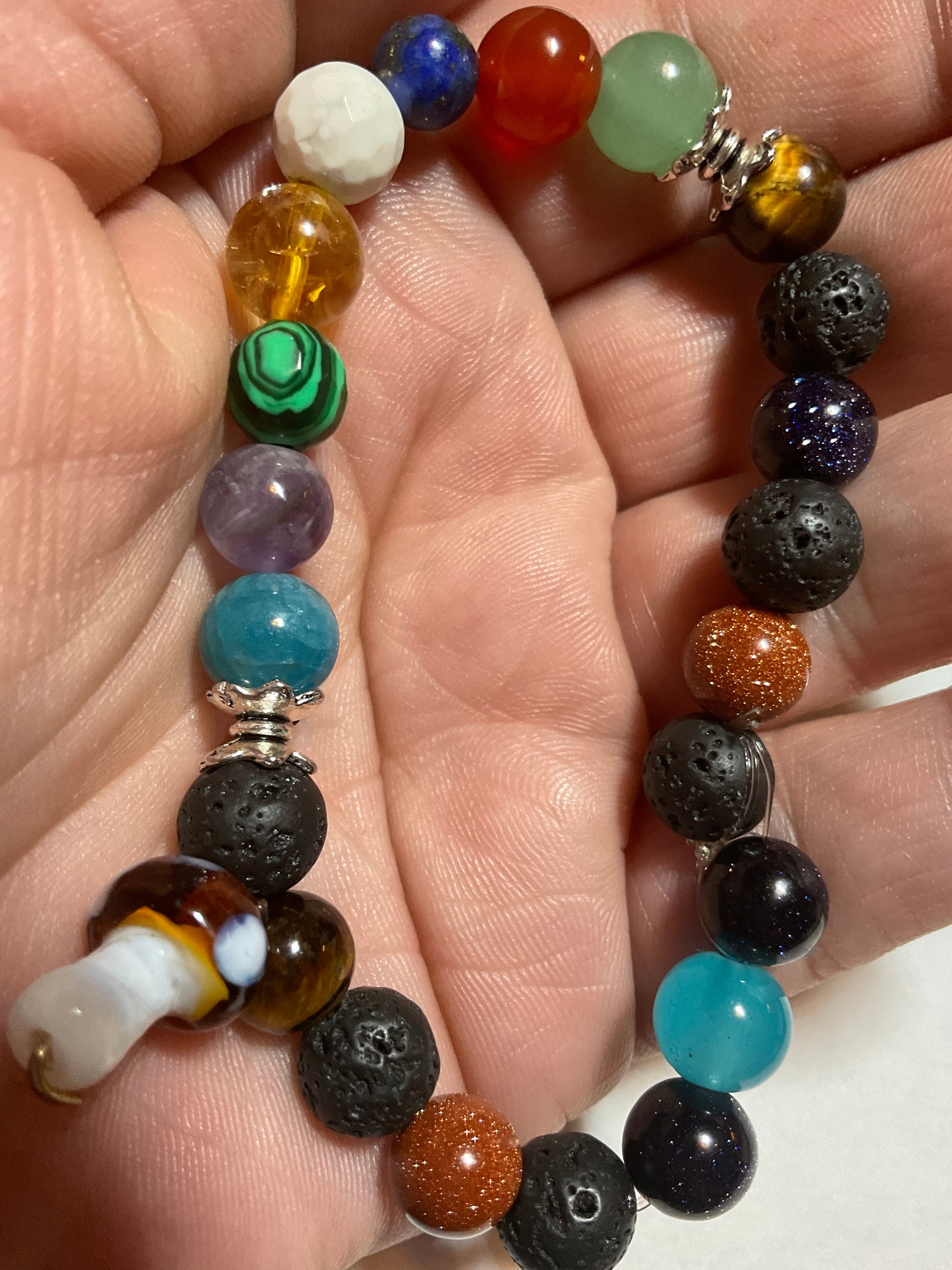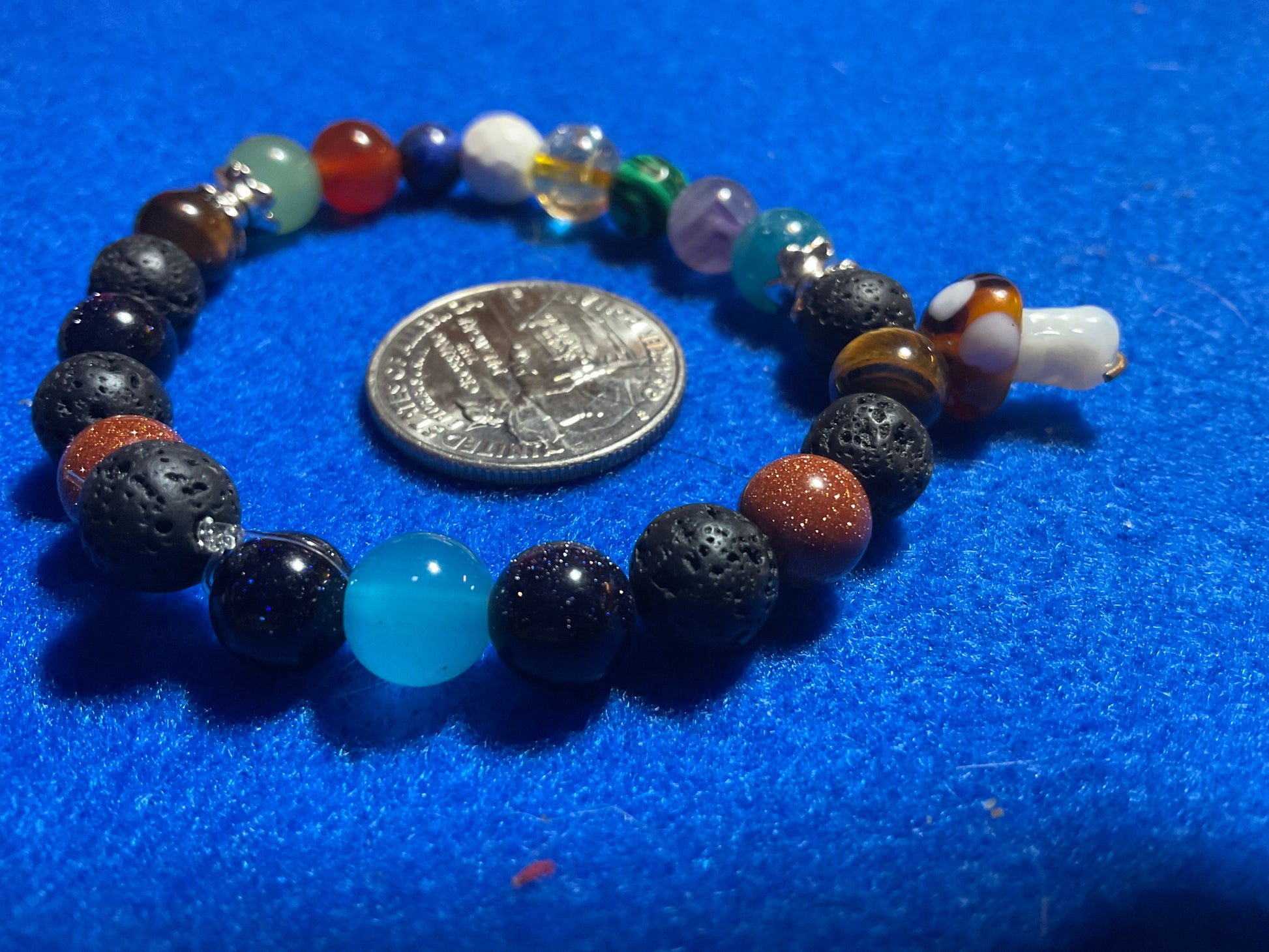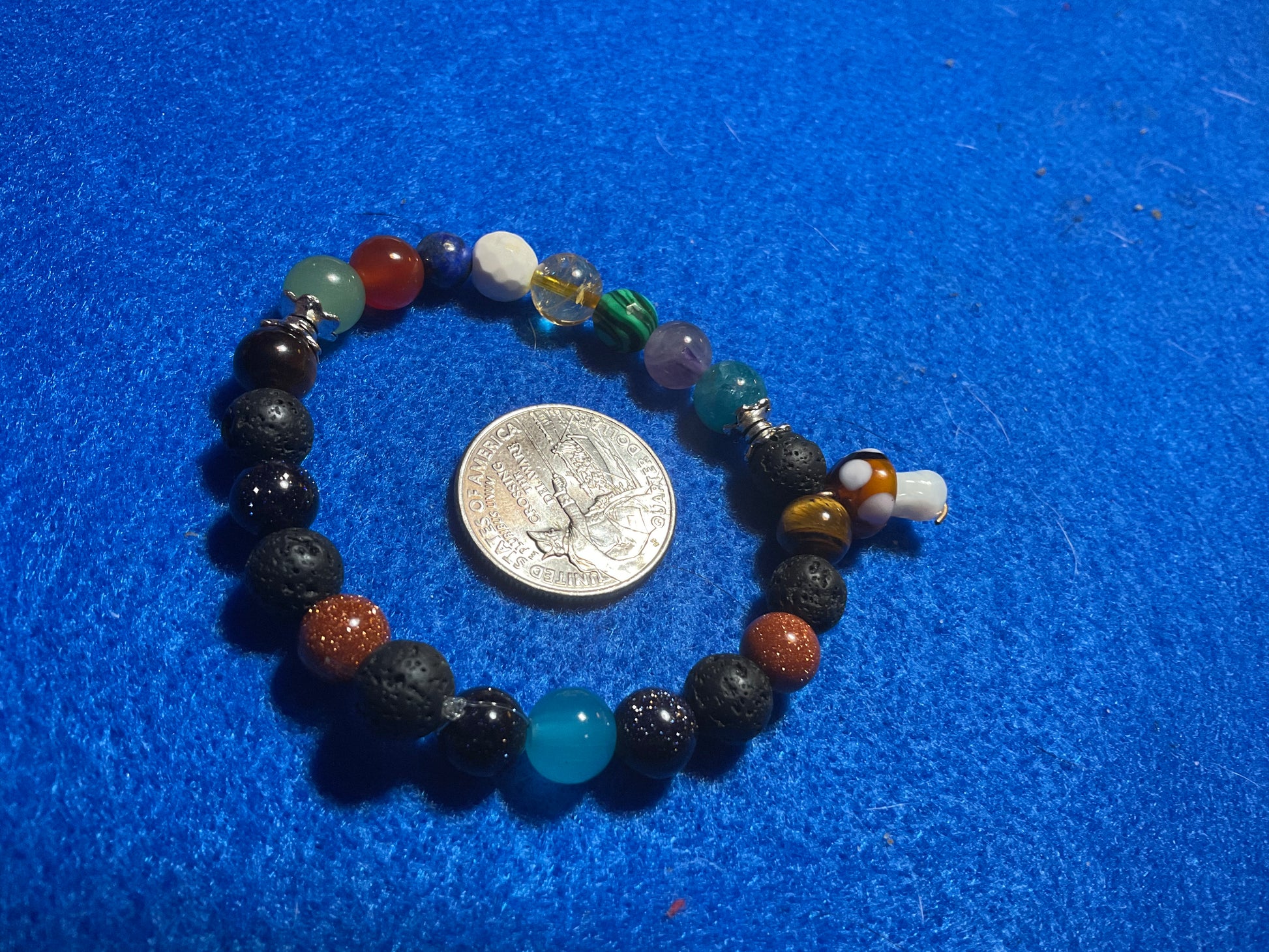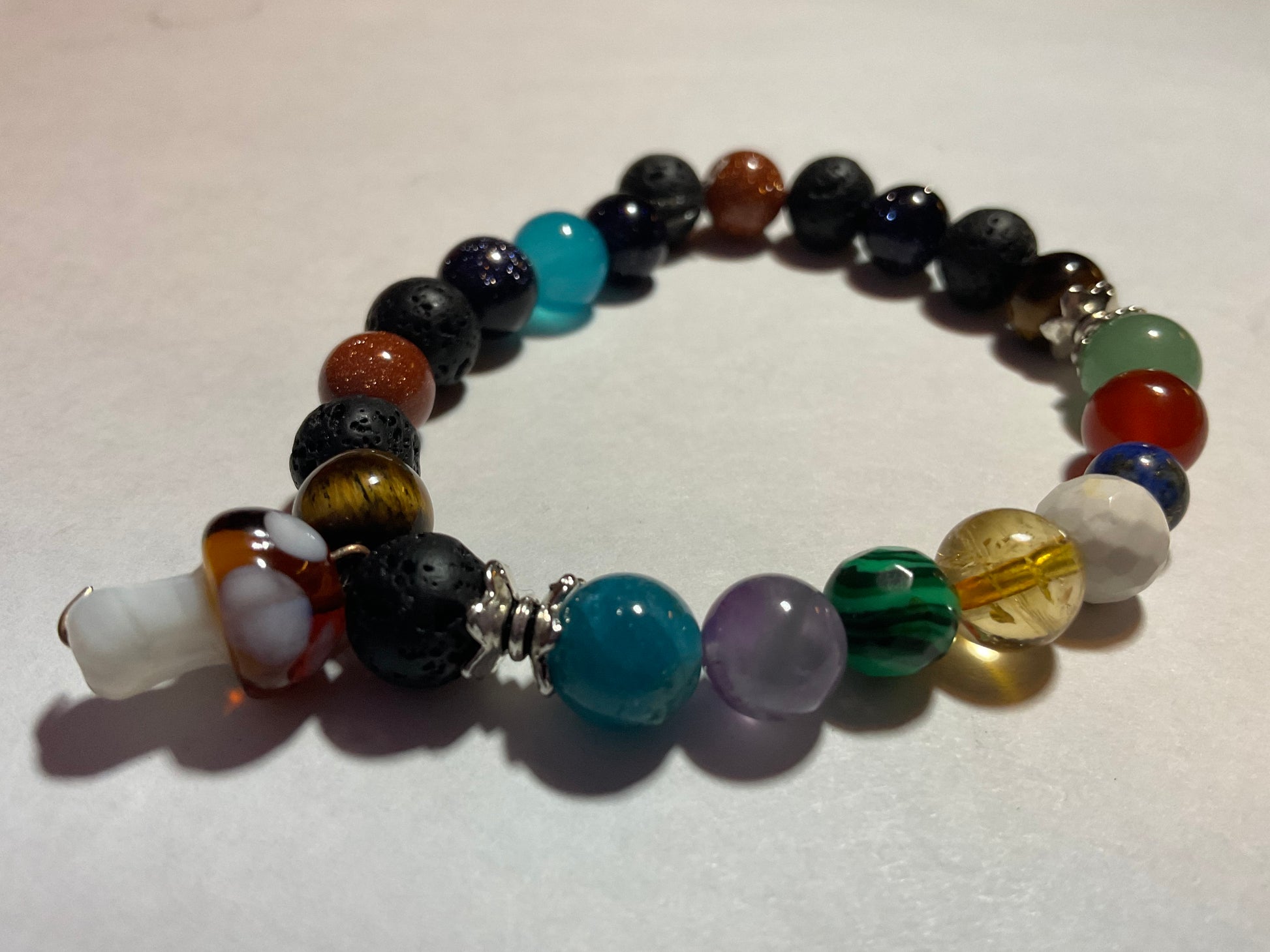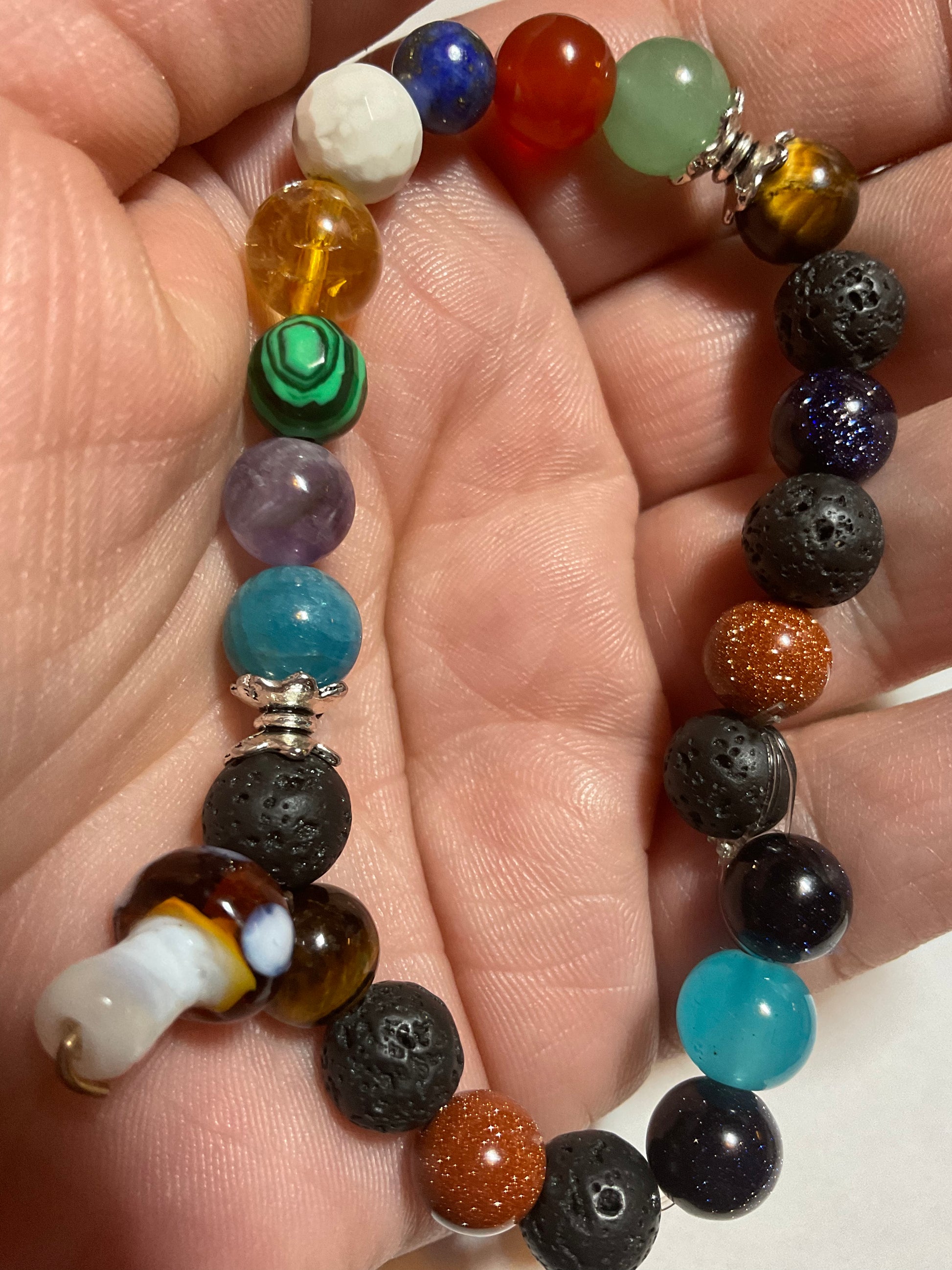 Goldstone, Blue Goldstone, Black Lava rock,Aquamarine,Amethyst, Malachite ,Citrine, Howlite, Carnelian, & Aventurine, featuring a mushroom charm dangling from the bracelet. It measures 7 3/4 inches around and is elastic so one size fits most. .Thank you for looking, & visiting my site! All orders come gift boxed and wrapped in ribbon.