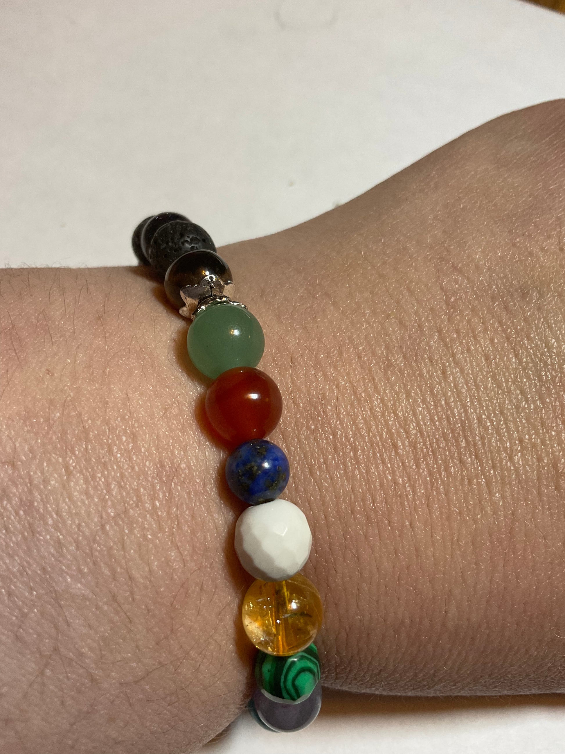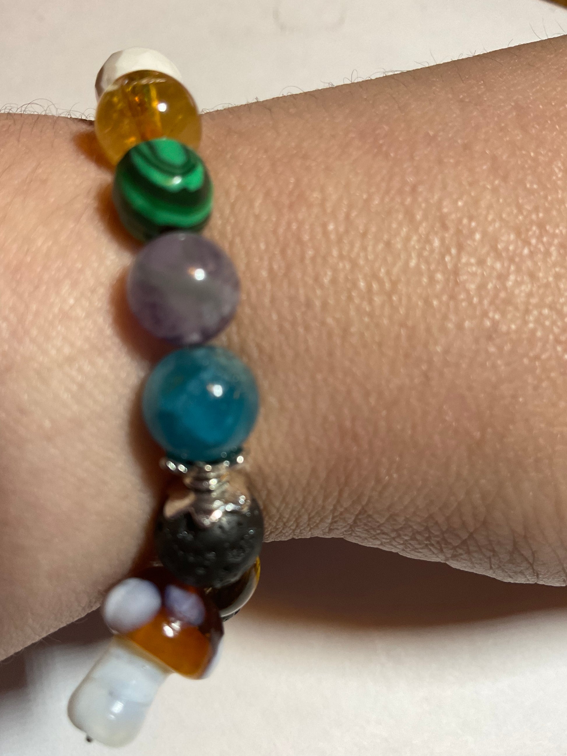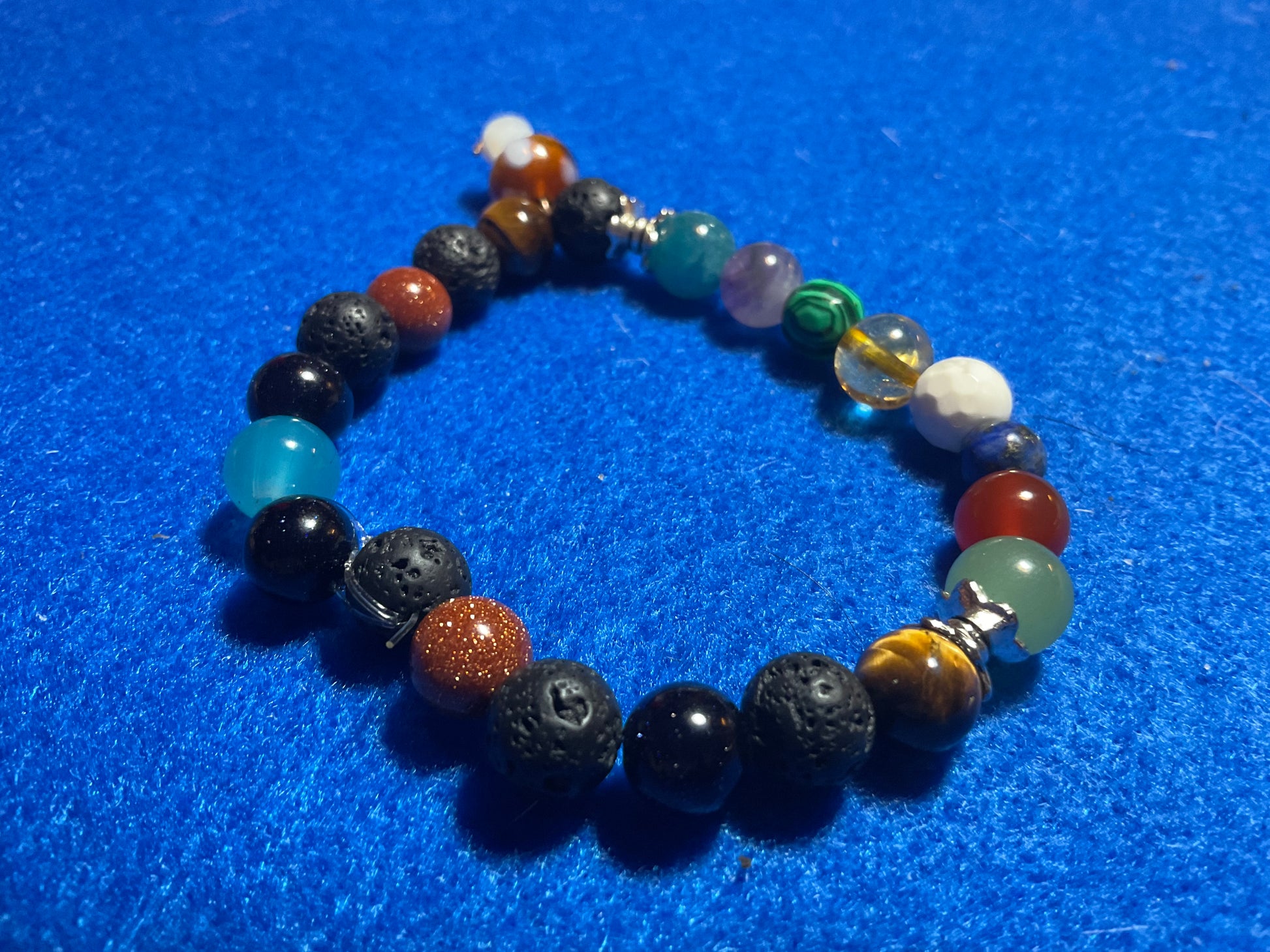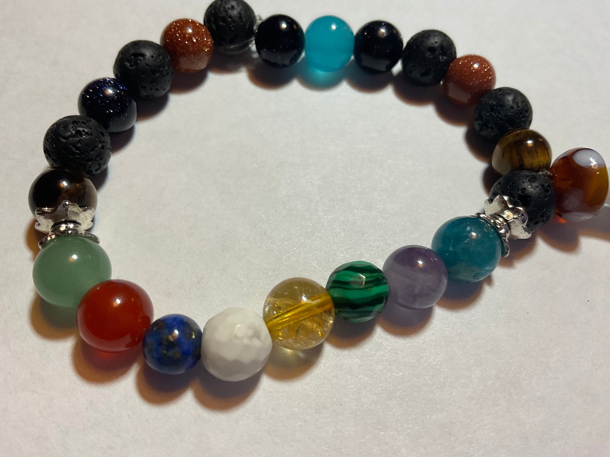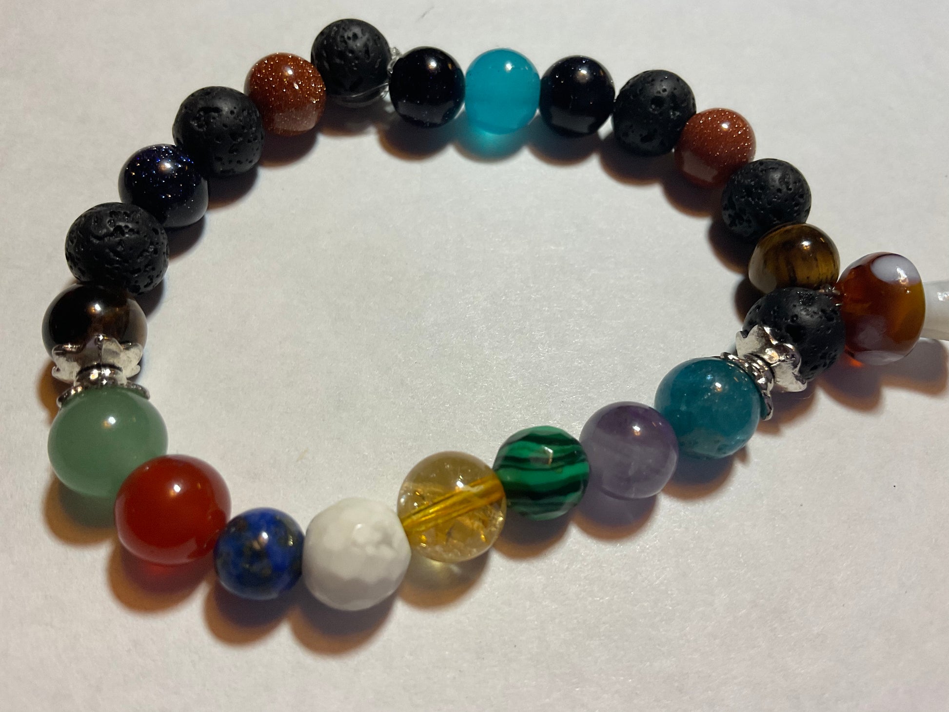 Goldstone, Blue Goldstone, Black Lava rock,Aquamarine,Amethyst, Malachite ,Citrine, Howlite, Carnelian, & Aventurine, featuring a mushroom charm dangling from the bracelet. It measures 7 3/4 inches around and is elastic so one size fits most. .Thank you for looking, & visiting my site! All orders come gift boxed and wrapped in ribbon.