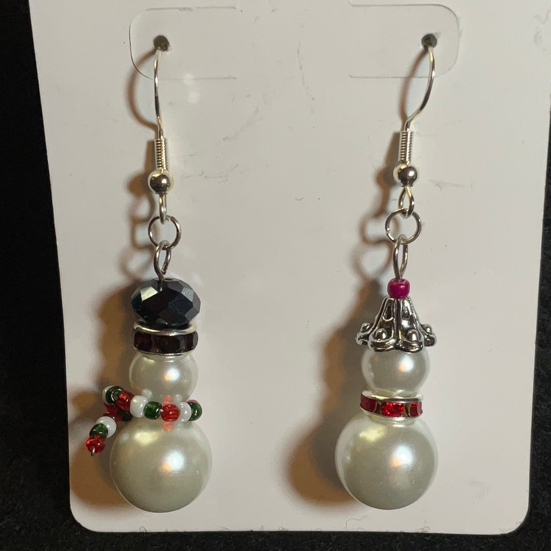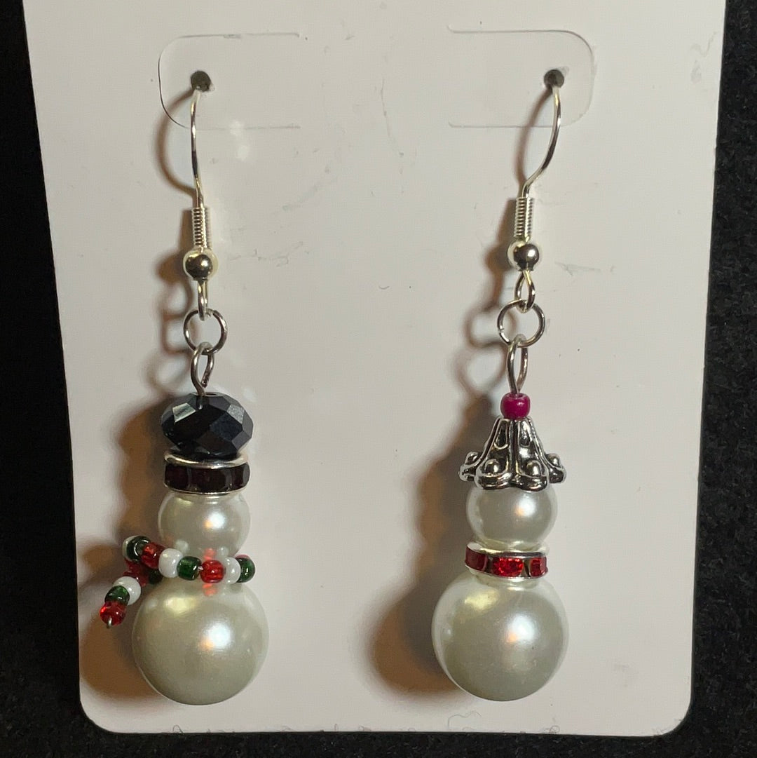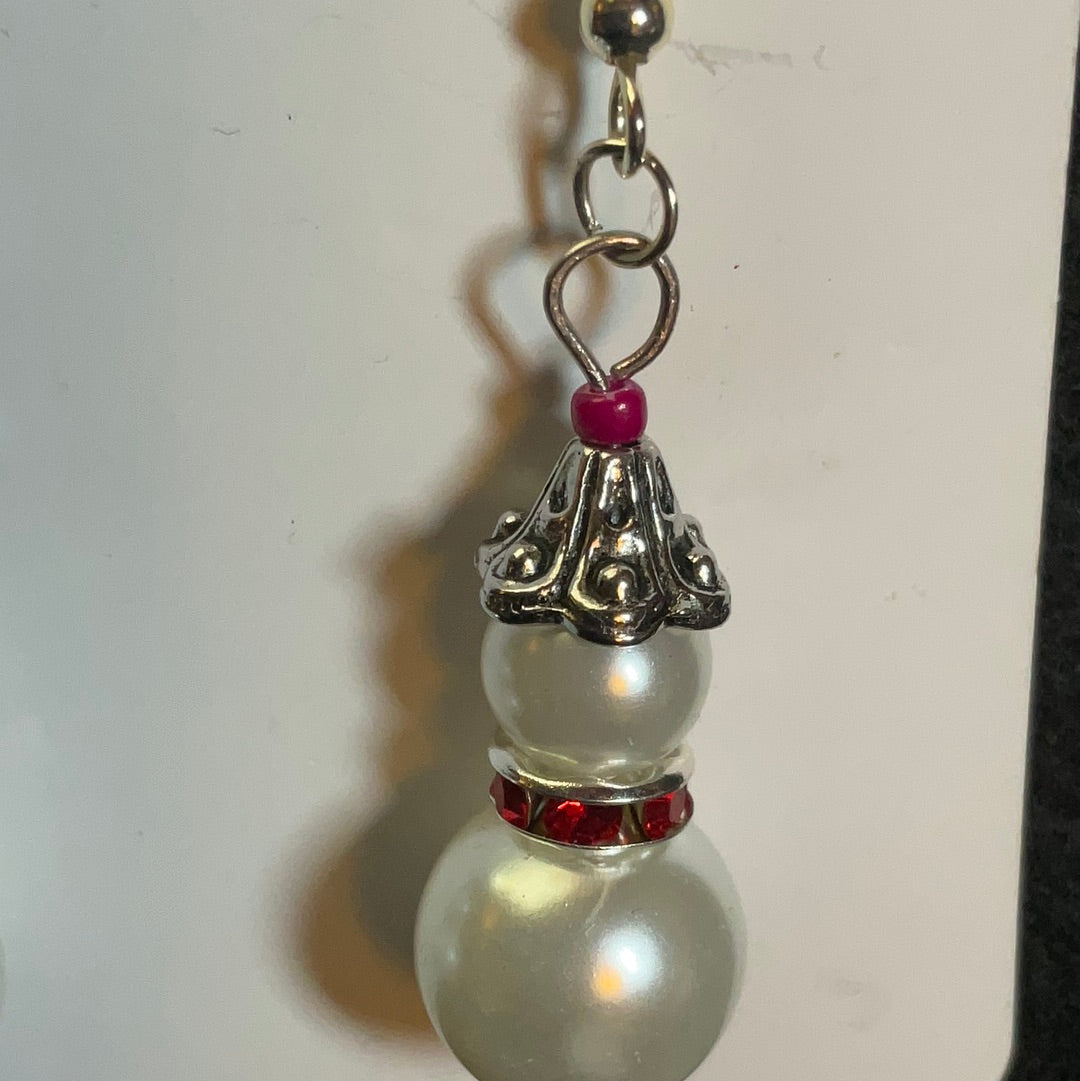 Snowman Couple With Scarf. White Glass Pearls, Swarovski Crystal, Tibetan Silver Bead Cap, colorful rhinestone rondelles and seed beads in Christmas Colors come together to make up this cute pair of earrings on 304 Stainless Steel French Style Fish Earhooks, Hypoallegenic for those with sensitive ear too.