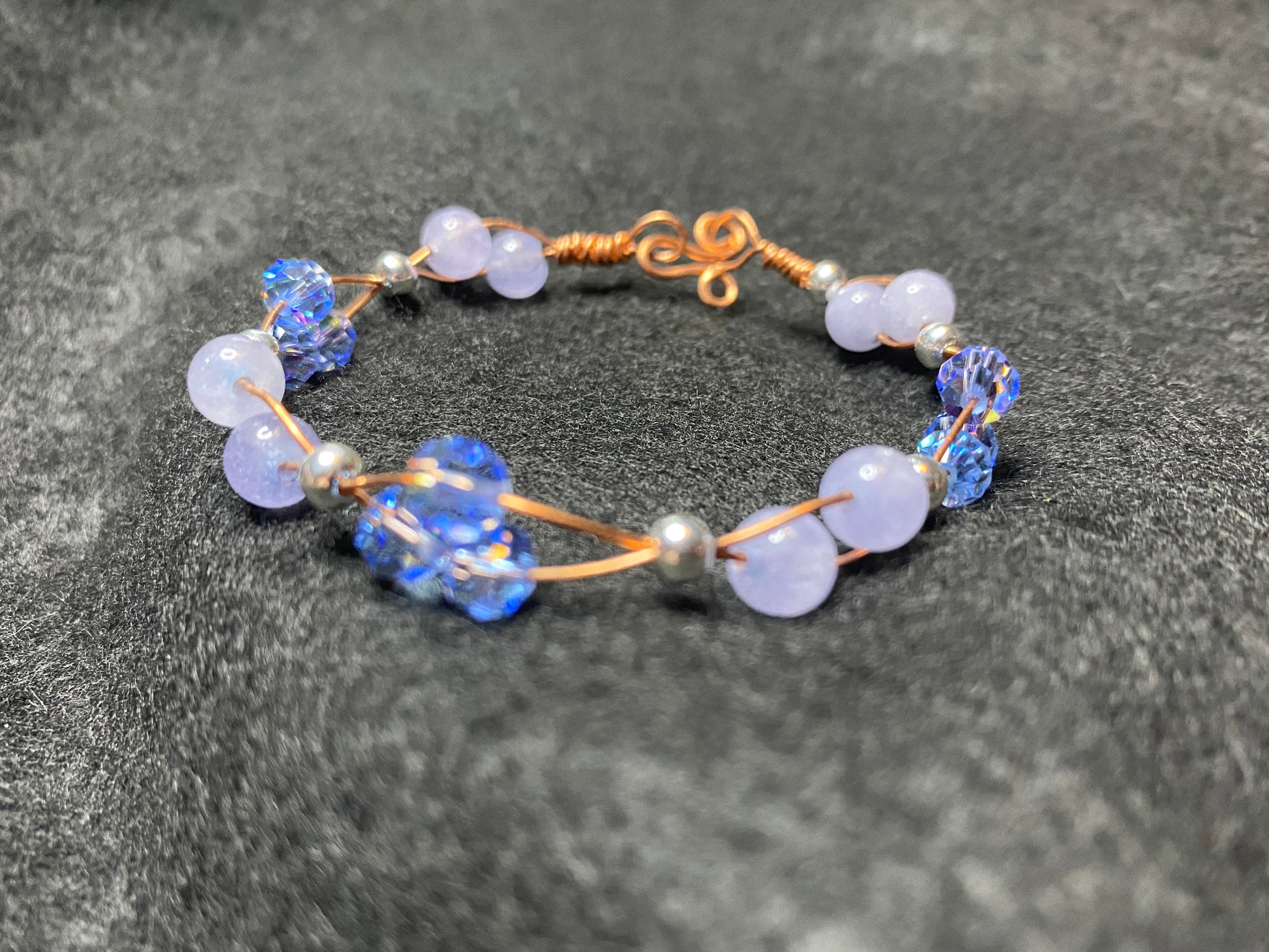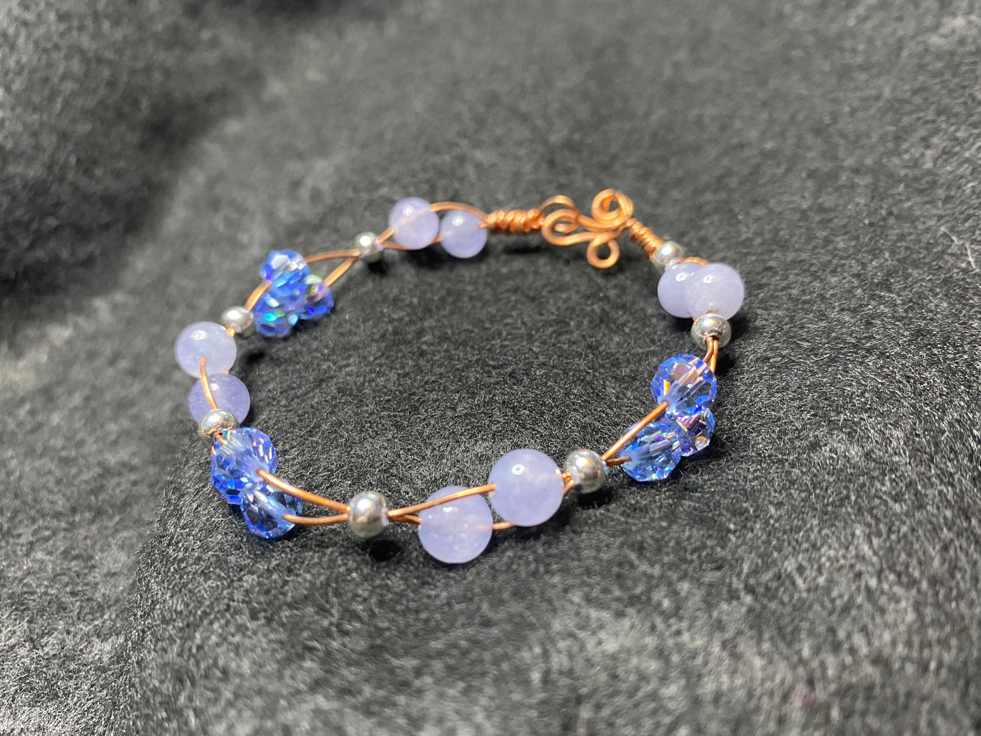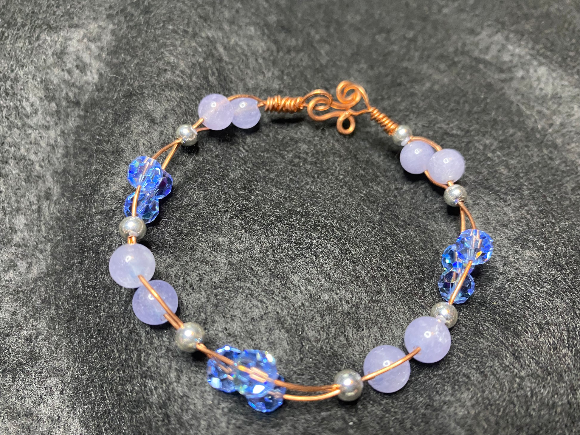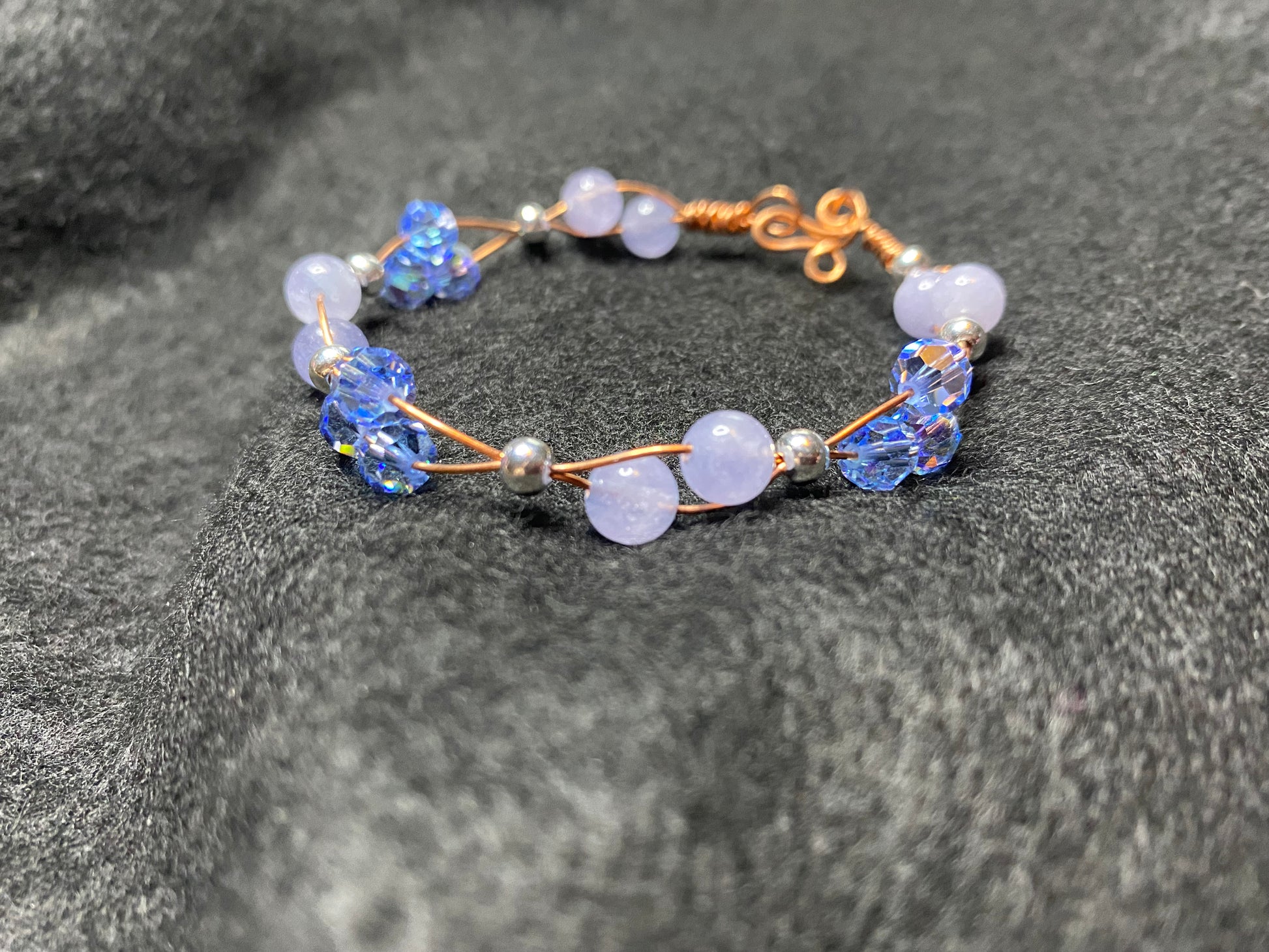 Beautiful Blue Aquamarine semiprecious gemstone beads, Swarovski Blue Crystals, & Sterling Silver beads adorn a bare copper wire bracelet. Fits 6” wrist. Artisan made in the USA. No need to wrap! Comes in white gift box. If another size is needed please email me.