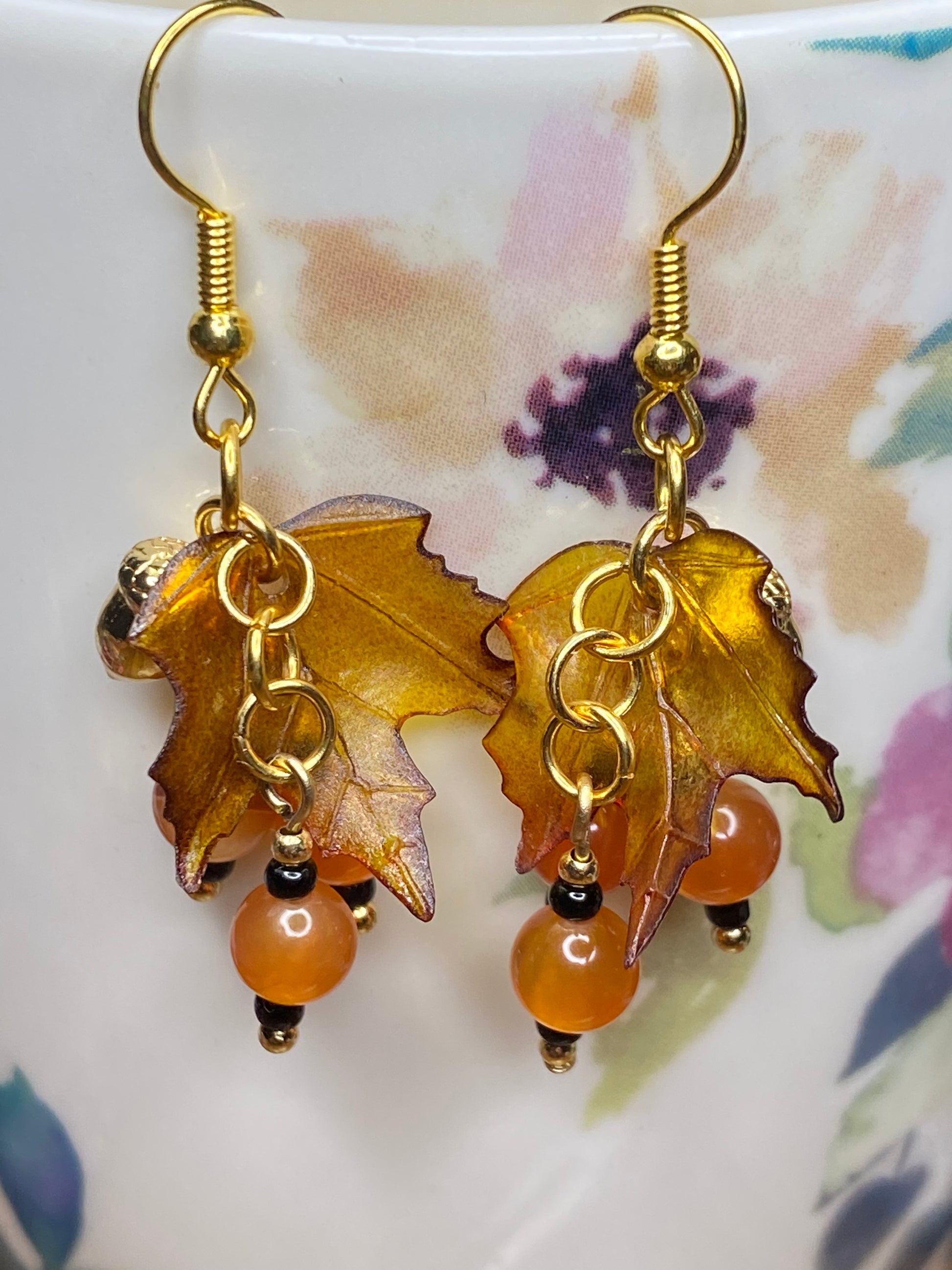 Artisan crafted 24kt Gold Plated Acorns & Carnelian Gemstones sway in front of a Hand Painted Acrylic Maple Leaf. A beautiful and stylish Earring. Earring hooks are 14kt Gold Plated. Gold plated accent beads with Black glass seed beads.