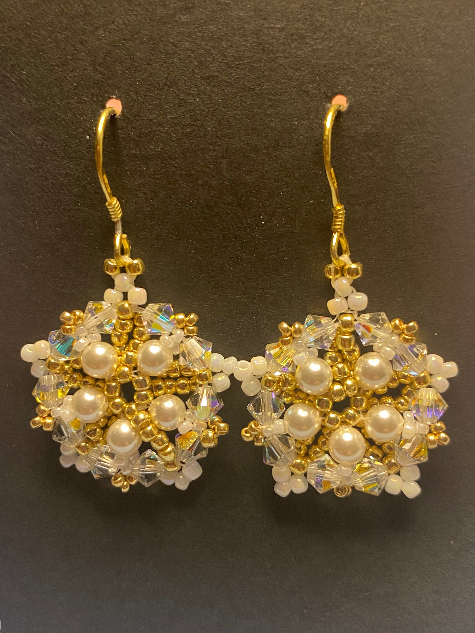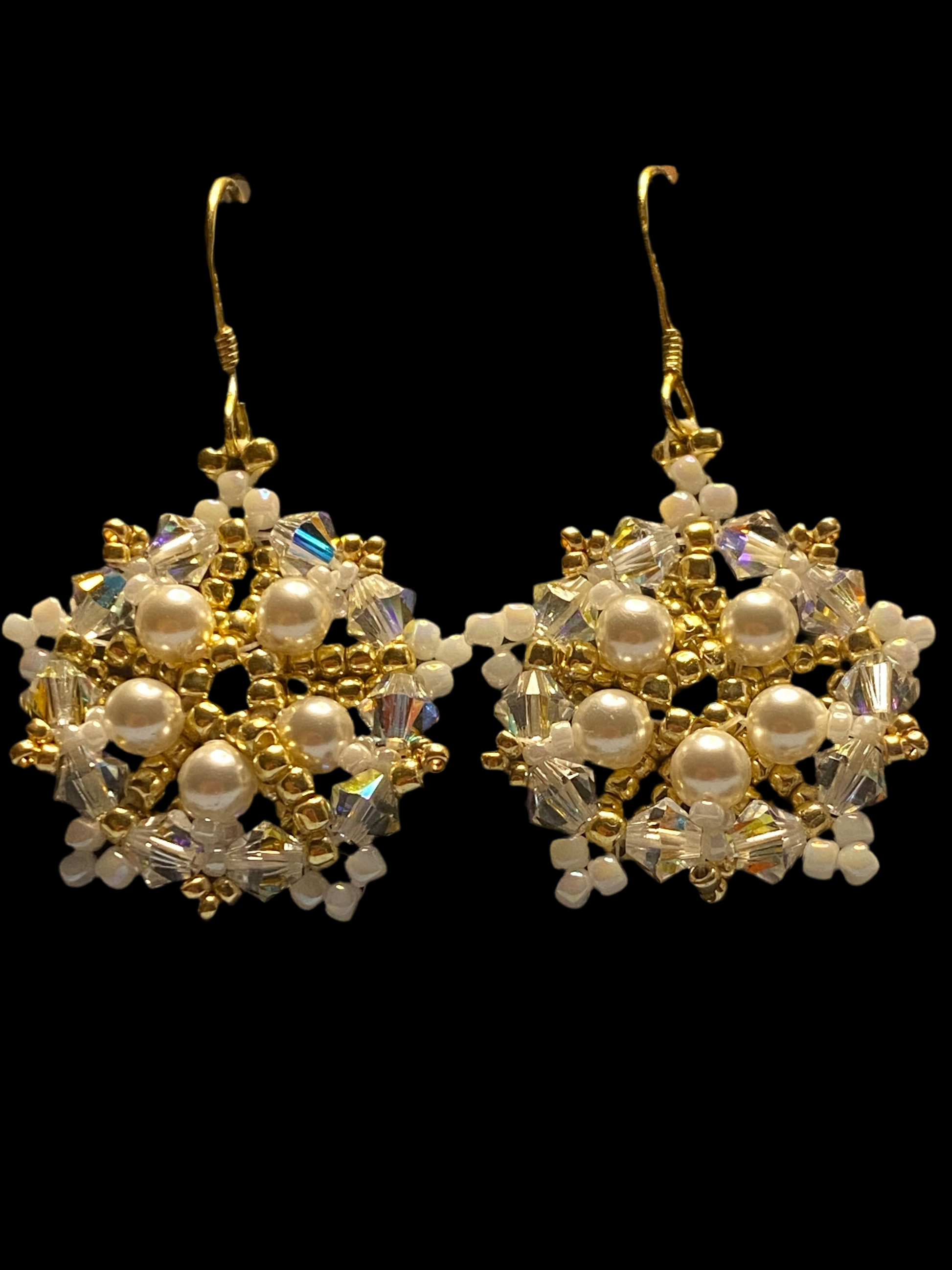 Indulge in elegant winter style with our White Snowflake earrings. Hand-beaded with high quality glass seed beads, these earrings feature stunning golden embellishments, 14kt gold over Sterling ear hooks, and luxurious Swarovski pearls and crystals. Elevate any outfit with these gorgeous and sophisticated snowflake earrings!.