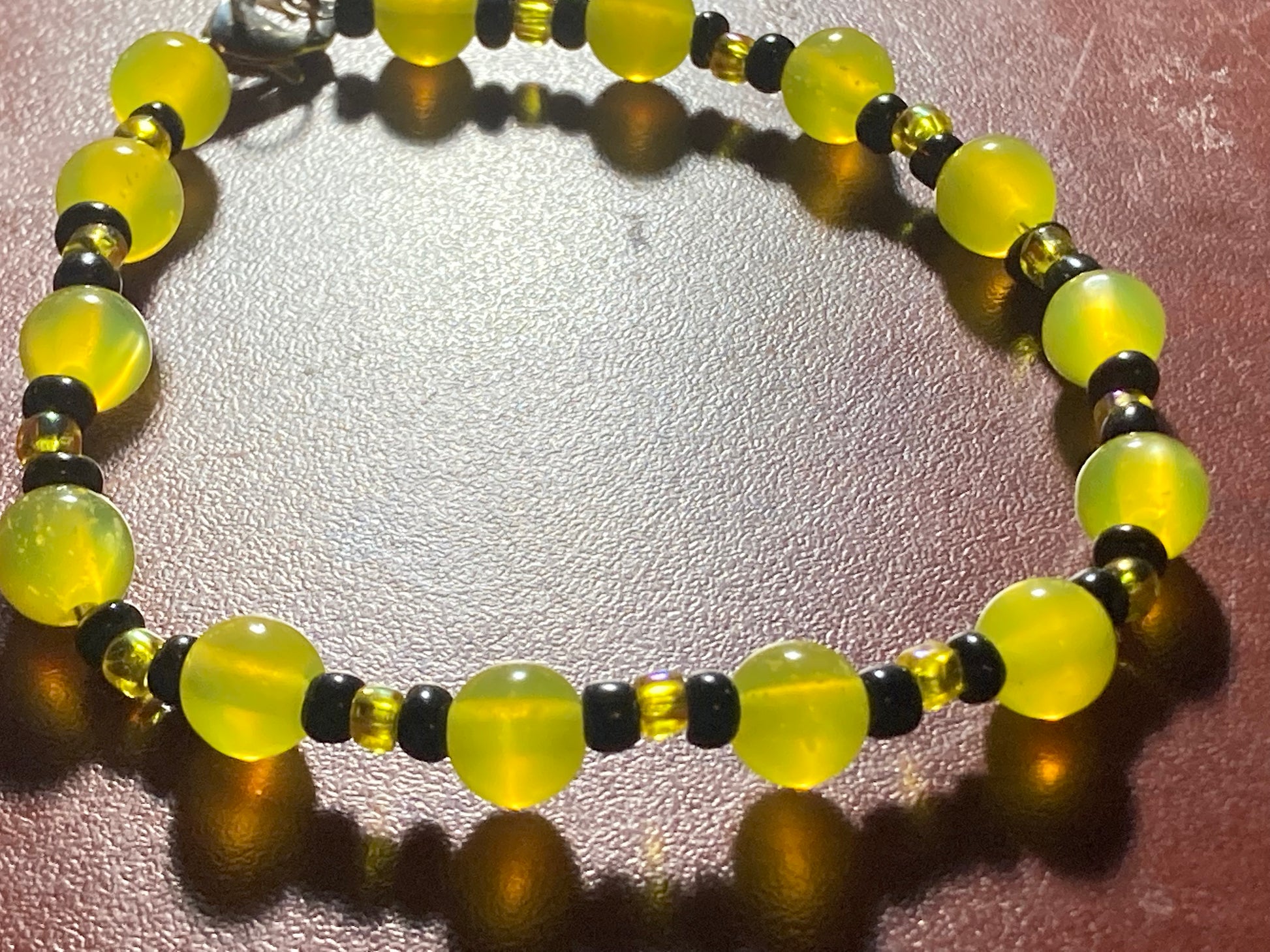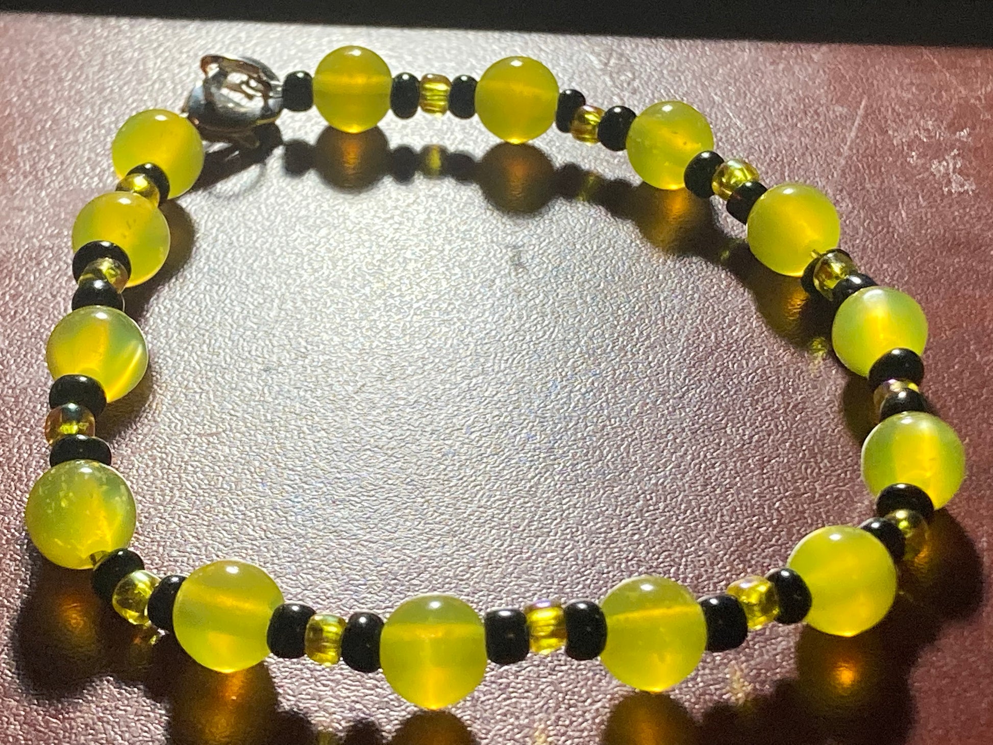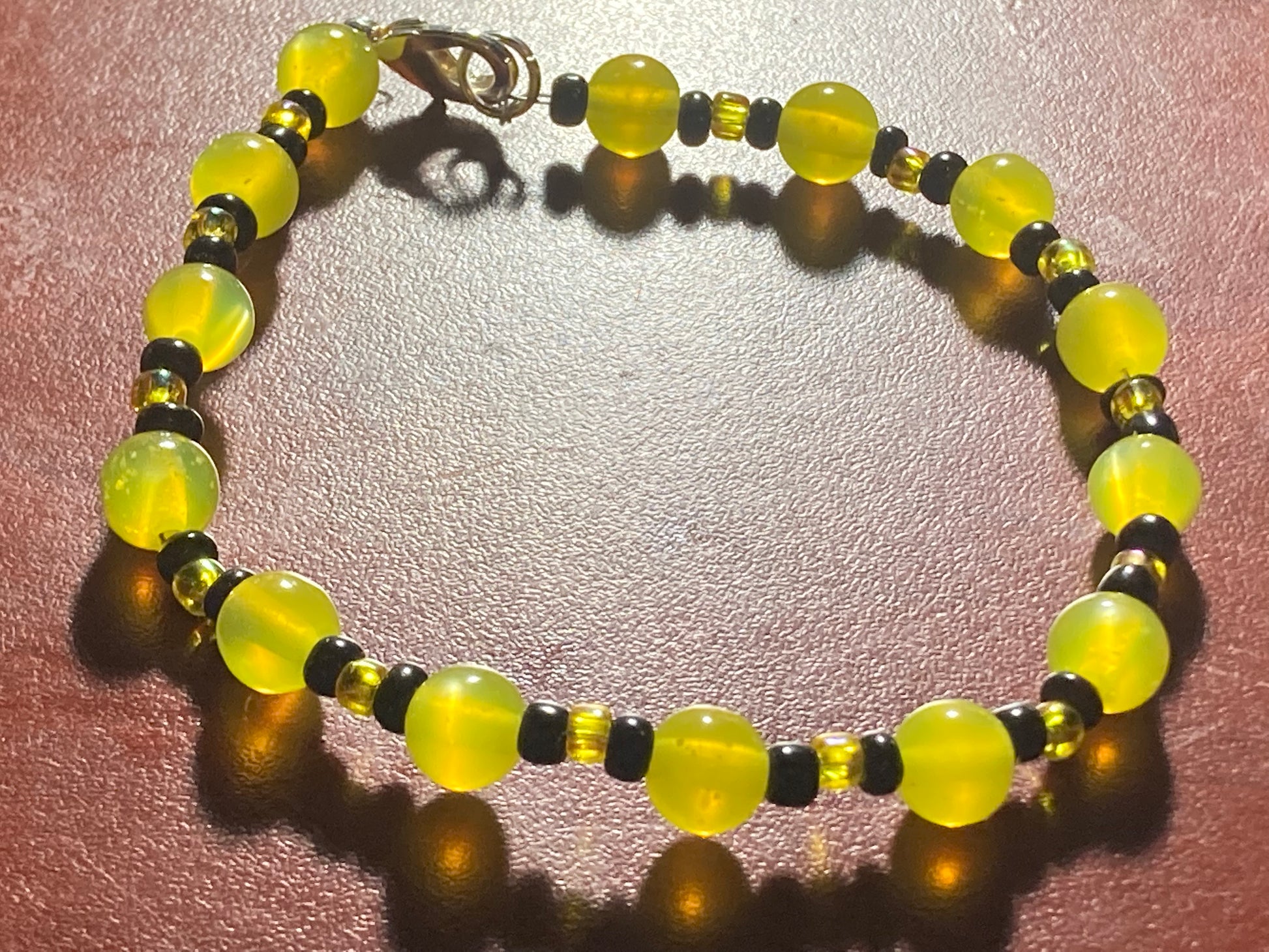 Yellow & Black beaded bracelet with a Lobster claw clasp. This bracelet measures approximately 7 3/4 inches around.